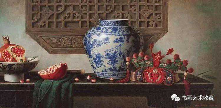 卢东明的静物油画绝非生活中自然美的简单复制,而是经过艺术的处理和过滤,用高潮的古典主义技法,极其精细地刻划,提炼升华出的艺术精粹,景物的描绘显示了一流的扎实功底。那细腻刻划的瓷器,桌案和花果,无论是色阶的递进,色层的敷设,还是明暗的推移与笔触的细致都达到了一种微妙自如的程度,正是这些在艺术表现语言方面的独到之处,即体现出中国文人画的儒雅意境,也能使观者感受到震撼。