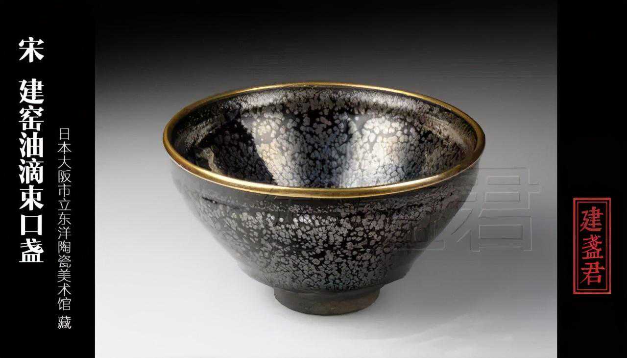 同样,被日本奉为“国宝”,可见中国宋瓷在日本的地位之高,当然也是因为品相极好,堪称神品。束口,釦金边,盏形周正无形变。盏内油滴密集均匀分布,如浩瀚星河。