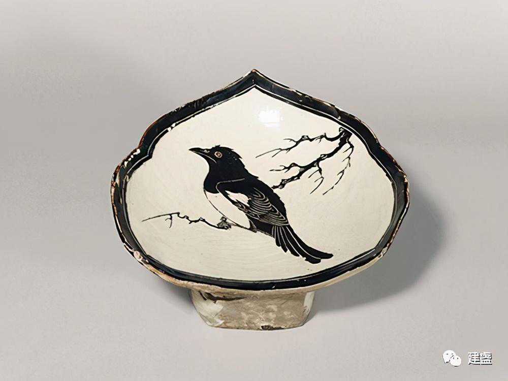 吉州窑木叶盏,特征尤为明显,底釉为黑色,一叶或多叶桑叶入盏烧制而成,盏中的叶片纹路清晰,形态不一。