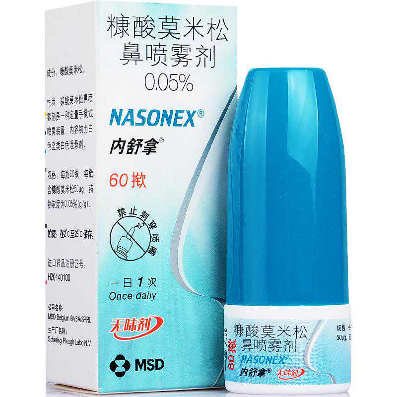 同样是由默沙东公司生产,用于预防和治疗成人、青少年和3至11岁儿童季节性或常年性鼻炎。使用方法:成人(包括老年患者)和青年:用于预防和治疗的常用推荐量为每侧鼻孔2揿(每揿为50ug),一日1次(总量为200ug),一旦症状被控制后,剂量可减至每侧鼻孔1揿(总量100ug),即能维持疗效。如果症状未被有效控制,可增加剂量至每侧鼻孔4揿的最大每日剂量,一日1次(总量400ug),在症状控制后减小剂量。在首次给药后12小时即能产生明显的临床效果。3至11岁儿童:常用推荐量为每侧鼻孔1揿(每揿为50ug),一日1次(总量为100ug)。