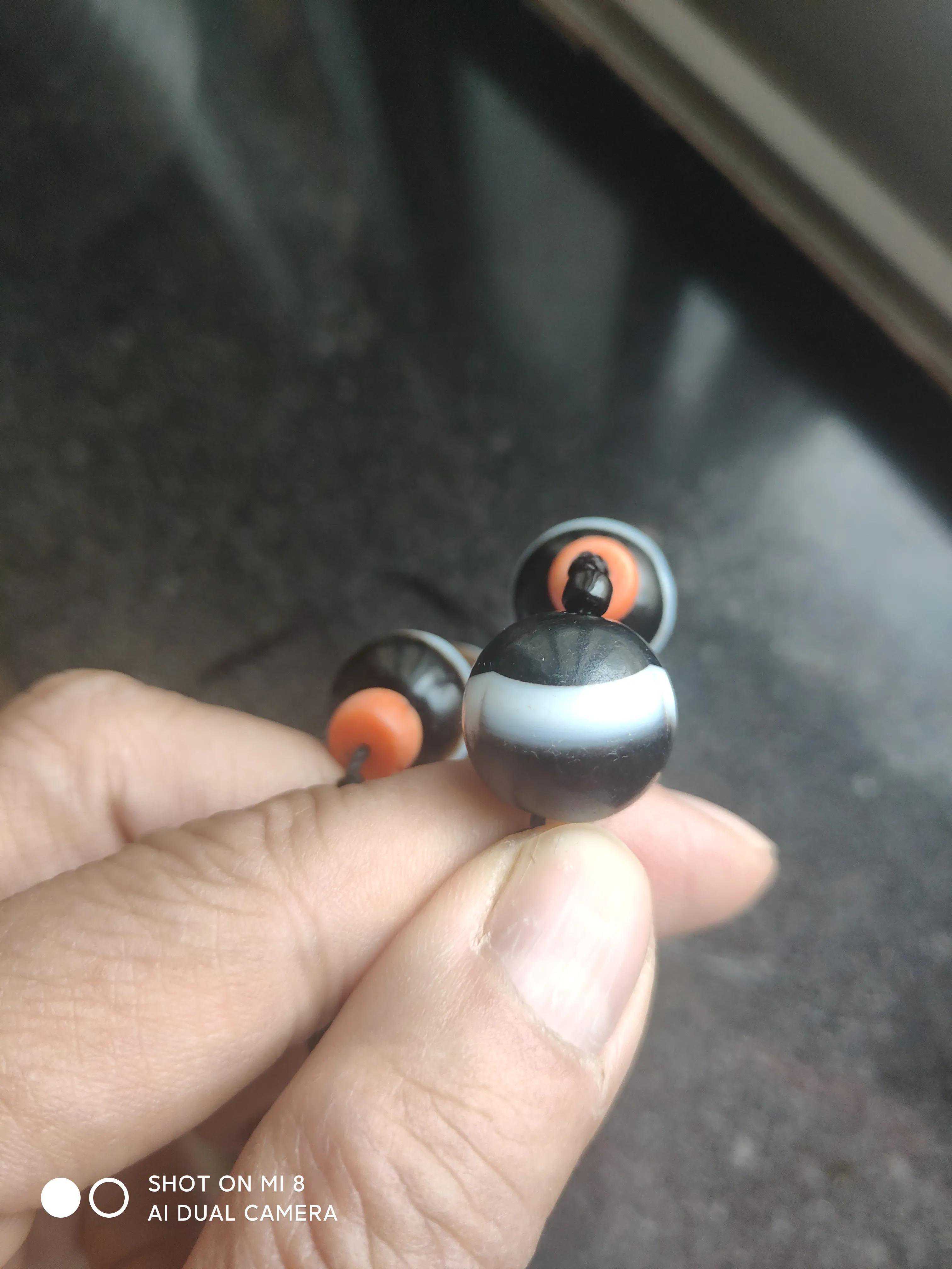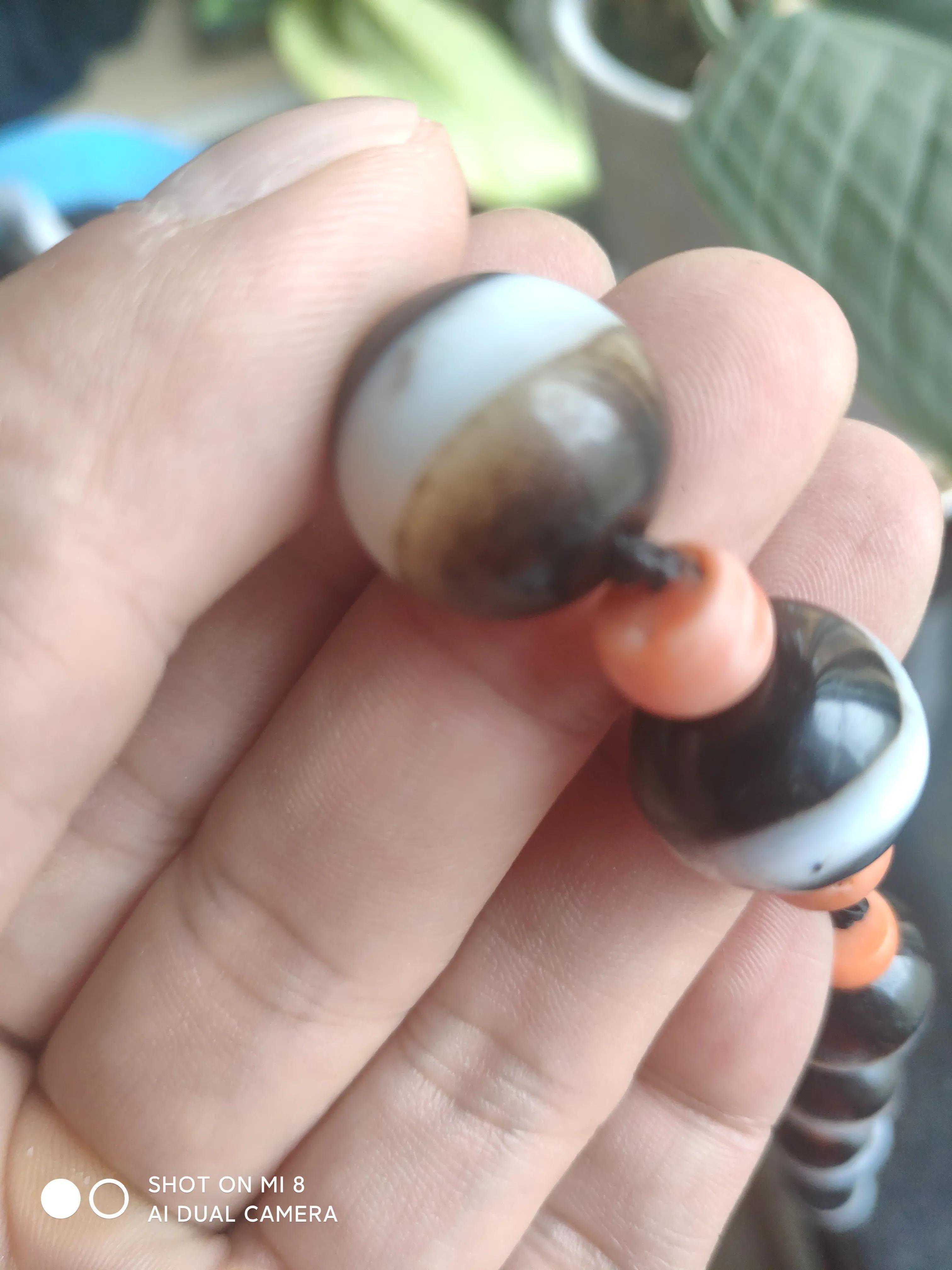再看此珠更加明显,原本是黑白珠,通过染色以达到控制白线宽窄的目的,但由于玛瑙密度较大,染色没有染透,露出白色底色。