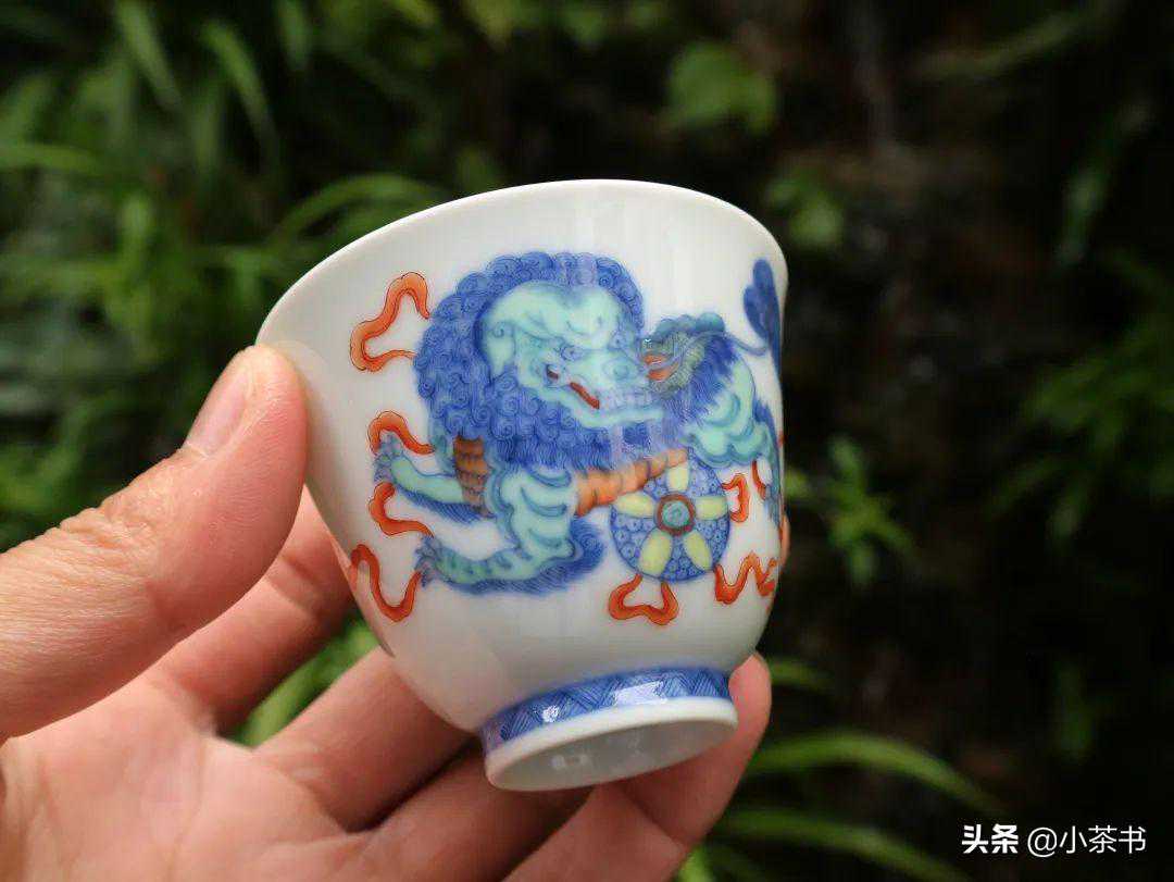 杯壁饰图与器型相得益彰,疏朗而浑然有致。原料精选天然矿石,画面设色有釉下青花及釉上叶绿、水绿、鹅黄、姜黄、矾红等彩料,运用了填彩、覆彩、染彩、点彩等技法,以青花勾线并平染鬃毛,以水绿覆大狮子狮身主体,鹅黄、姜黄覆小狮子主体。