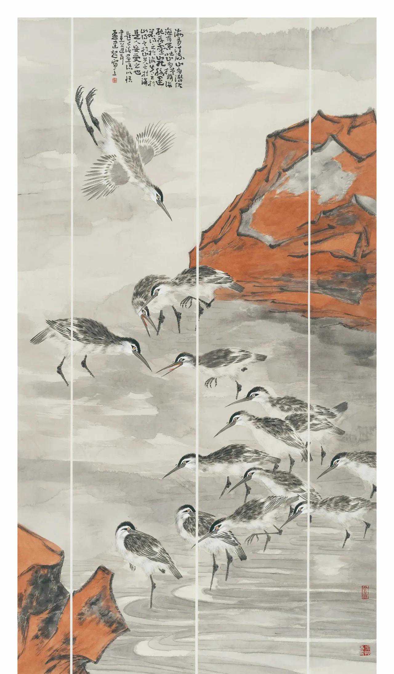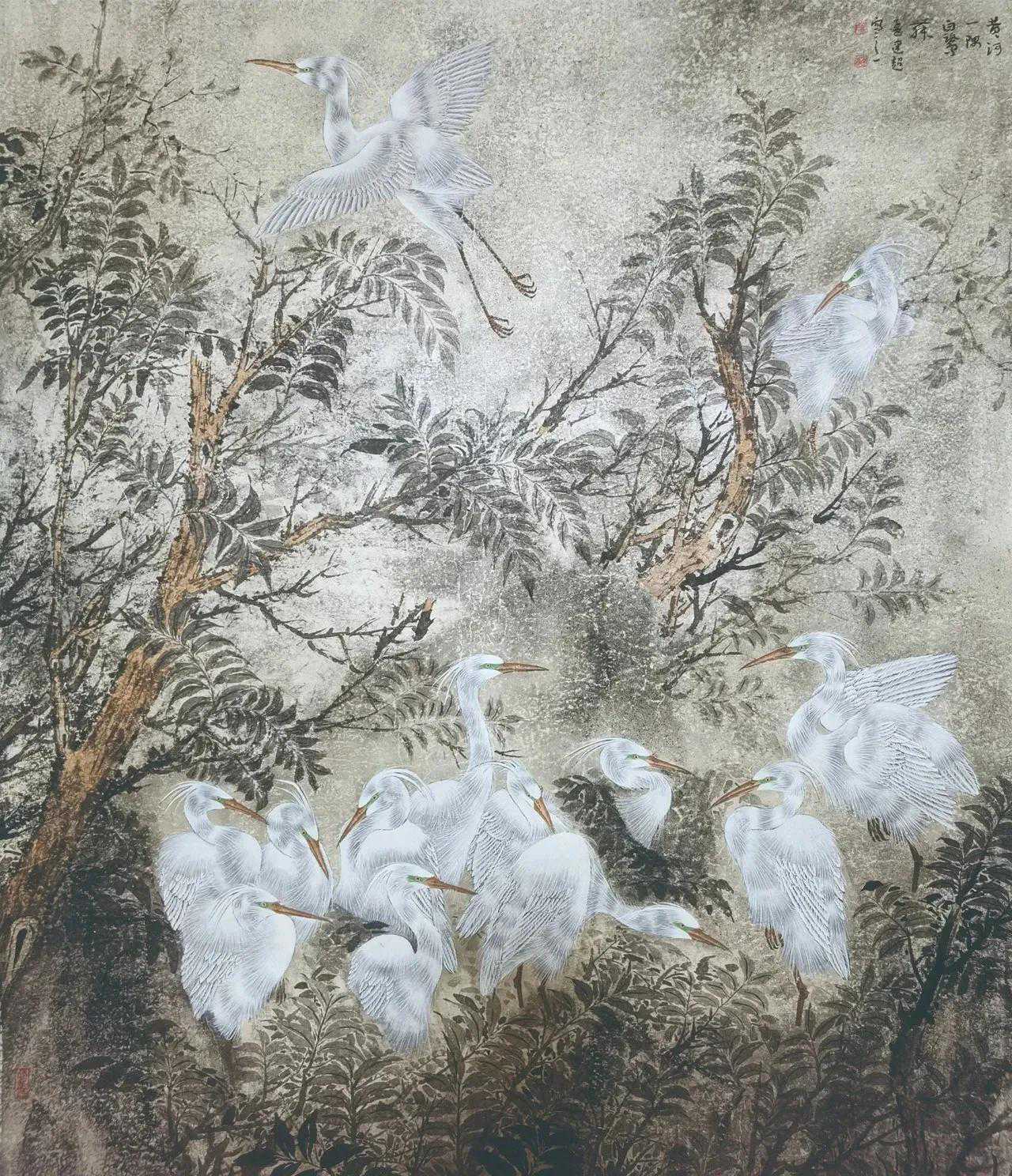 花鸟画自古就有抒发胸臆的传统,是历代文人精神的寄托。孟建超笔下的花鸟倾注了自己的内心情感和志向,将师古人与师造化兼收并蓄,既有鹰击长空的气势,又有池边鸥鹭的惬意。他的大幅注重造境,小幅注重意趣,每一幅画都构图精妙,疏密有致,笔墨潇洒,意境悠远,表现了传统花鸟画格物致知、气韵生动的内涵。其对花鸟的神韵刻画无不传情达意,将心灵与自然融为一体。