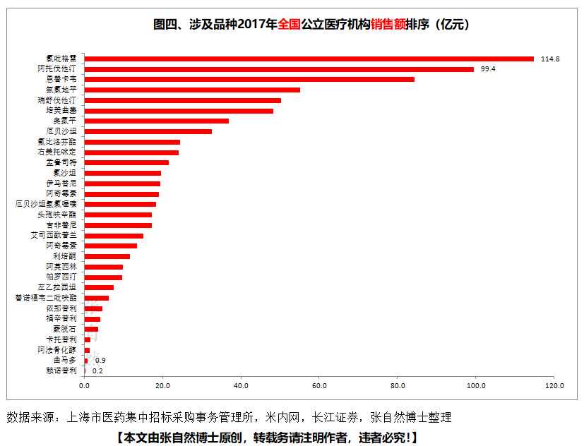 根据正式版公布的采购量,如按全国最低中标价计算,则采购总额为43.86亿元,采购金额最大的阿托伐他汀口服常释剂型的为9亿元,阿奇霉素注射剂以8亿元位居第二,卡托普利为零,赖诺普利仅100万元。
