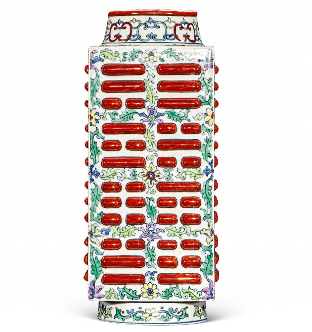 该器通体施白釉绘粉彩花卉纹,釉水纯净,色泽美好,器身作《易经》八卦图案,以矾红涂乾、坎、艮、震、巽、离、坤、兑八卦相互结合。琮式瓶大多无彩,有彩者亦大多为蓝釉金彩、青釉为主,粉彩琮式瓶极为罕见。