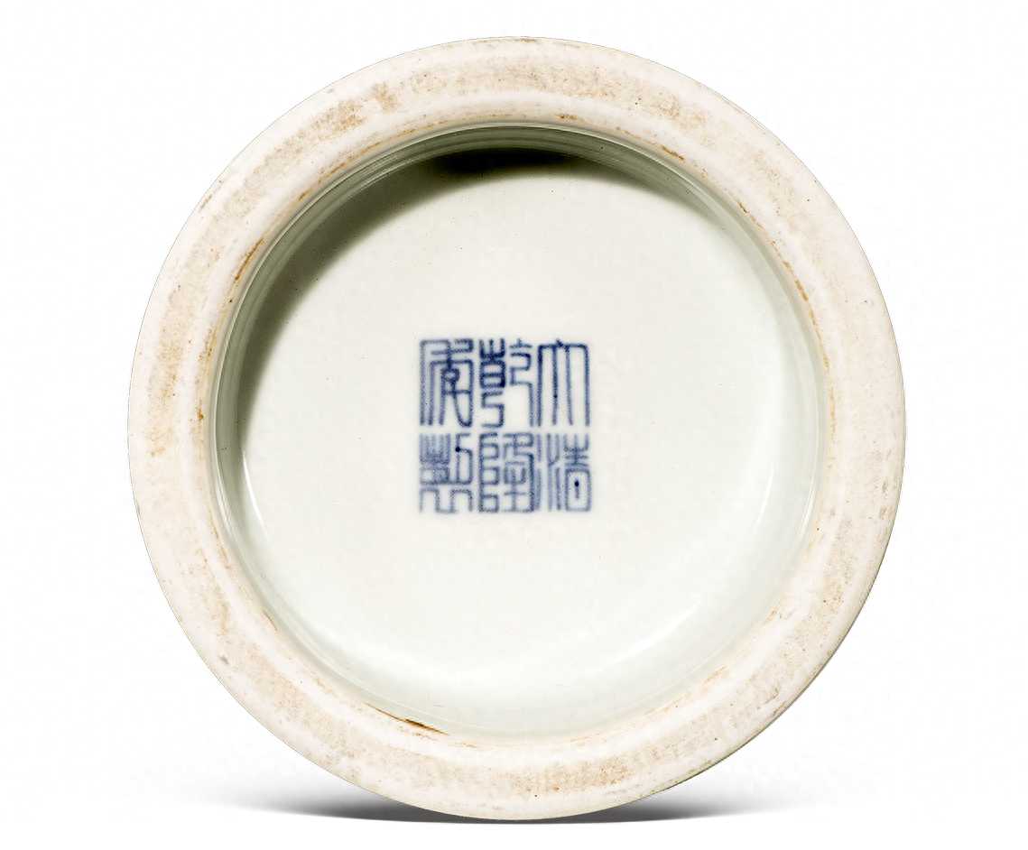 器作圆口,颈部较矮,外撇,折肩,方体,圈足较宽,整体造型呈天圆地方,仿史前玉器造型,宋官、哥有之,清代雍正以后各朝均见,清代后期逐渐增多,该器底书青花“大清雍正年制”六字篆书款,为标准官窑作品。