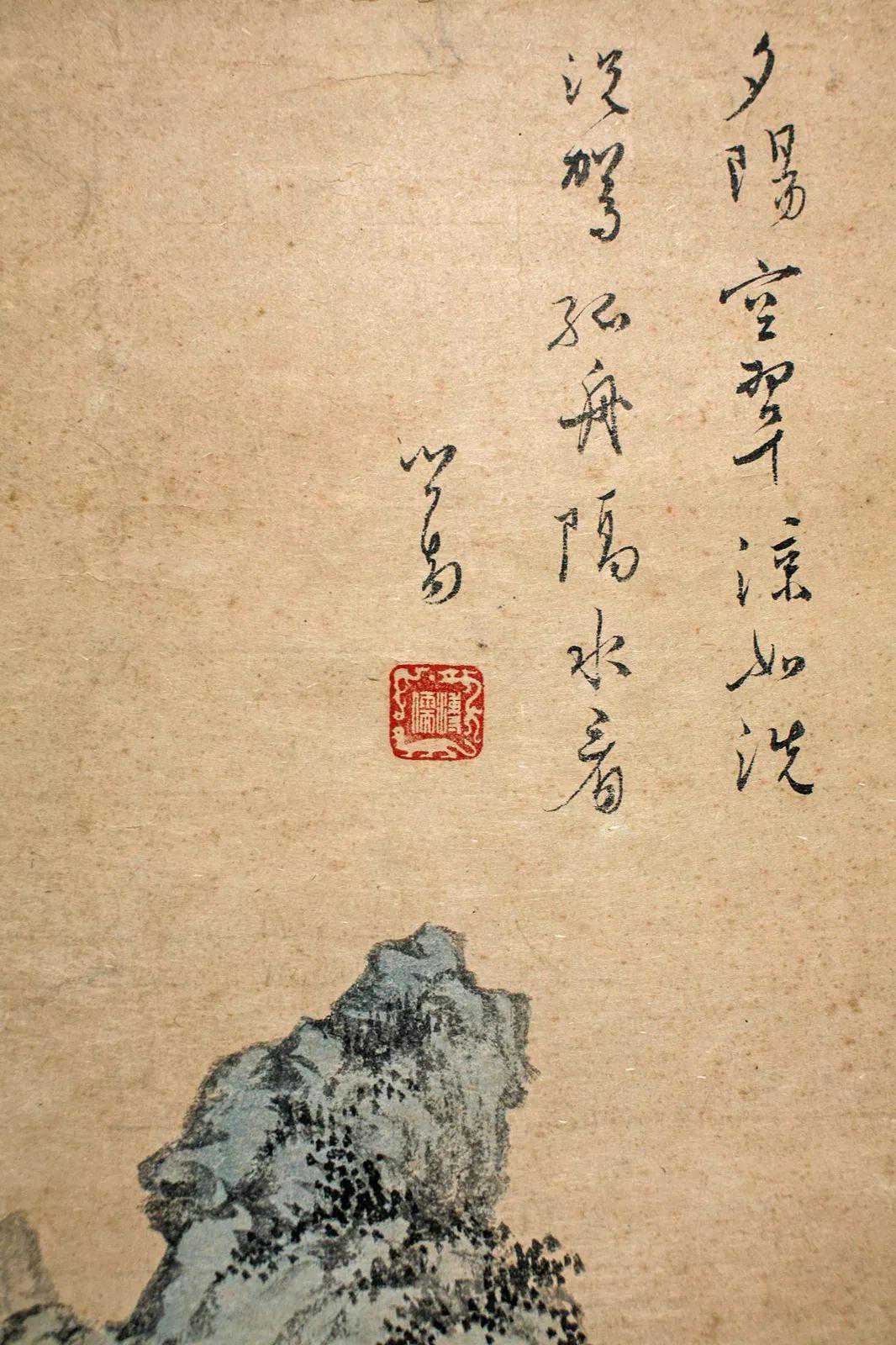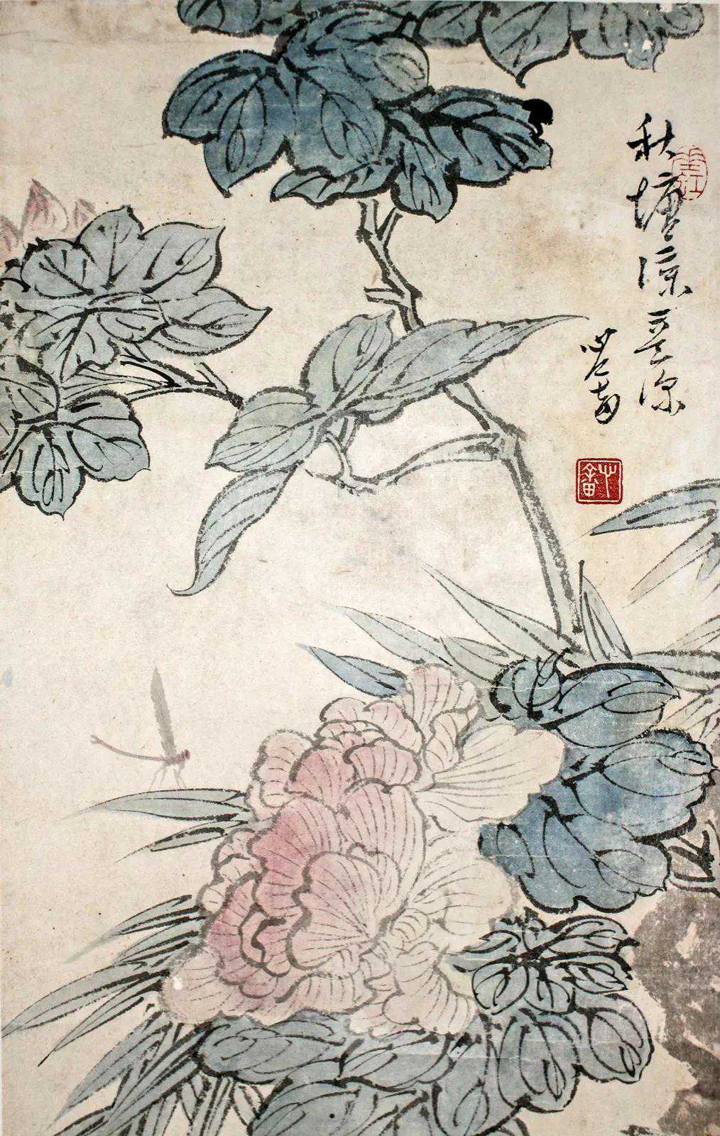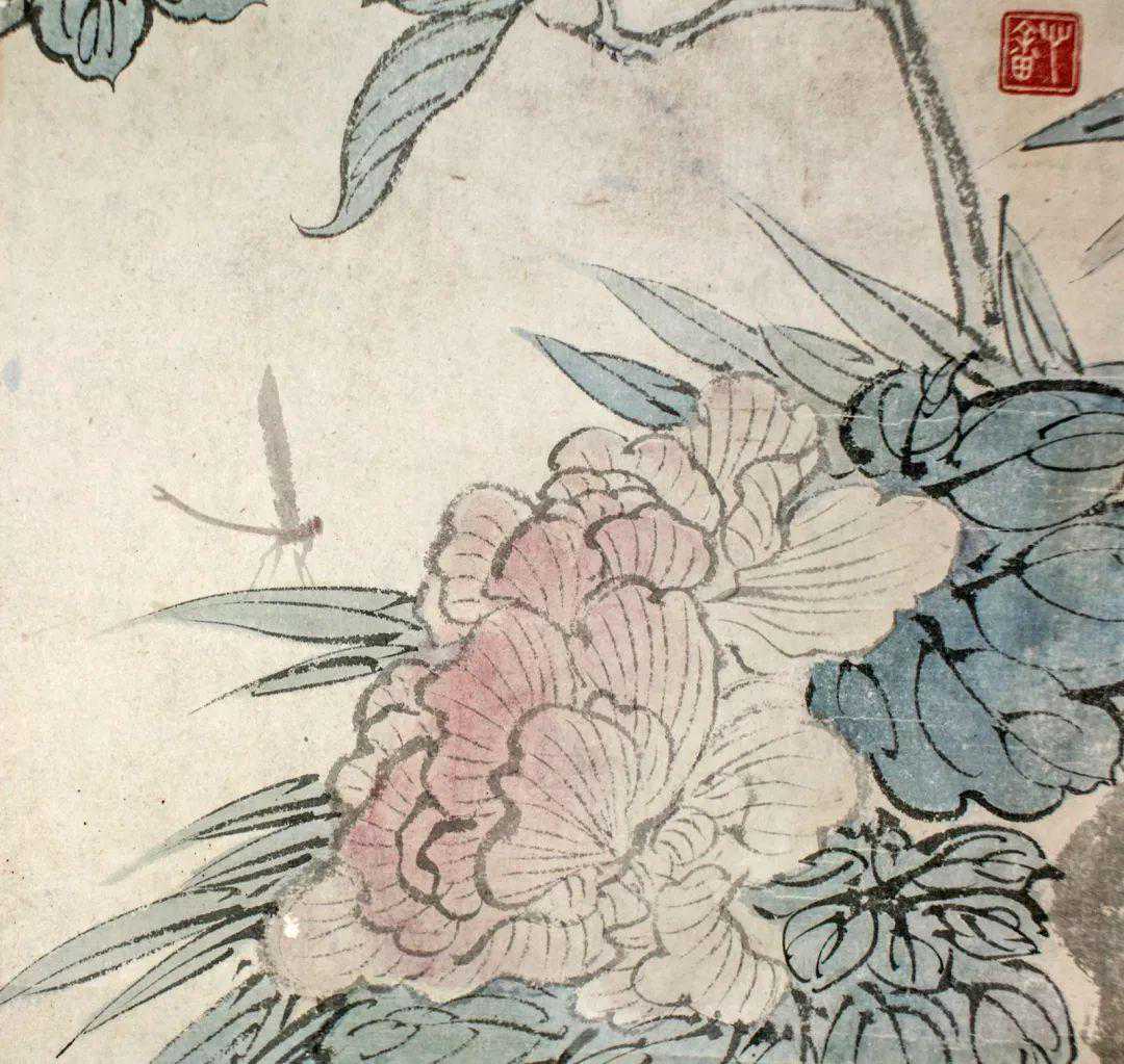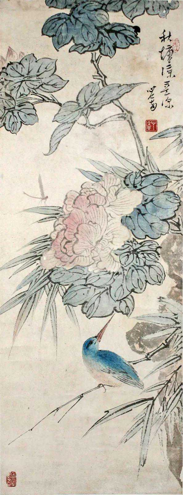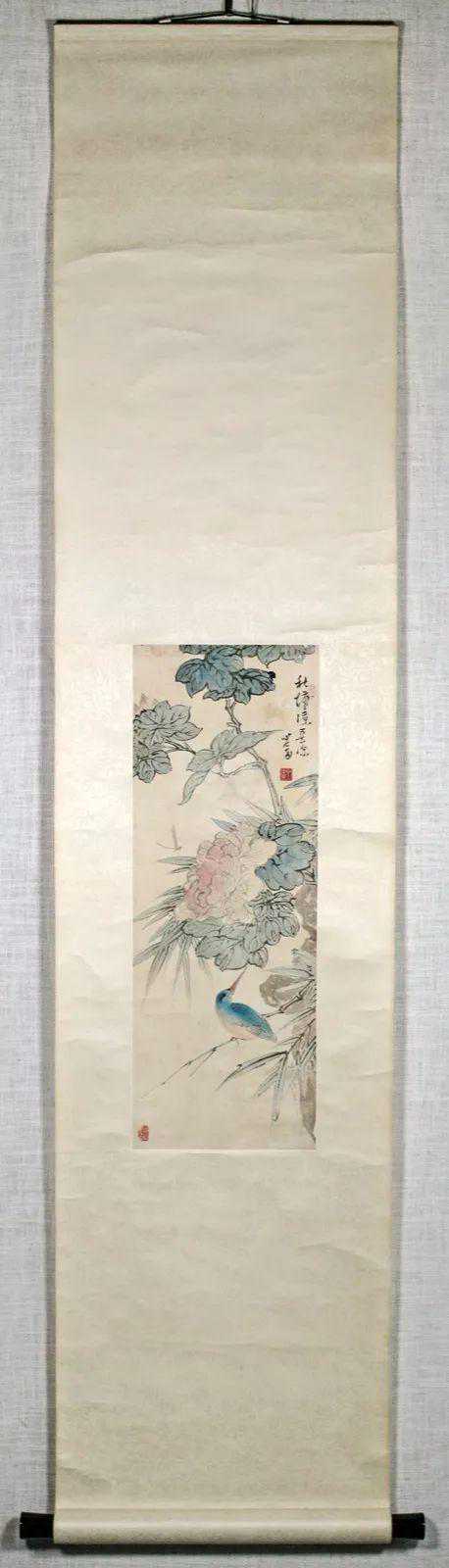 这件《秋塘凉意》画的很有趣,就比如这件《秋塘凉意》中花鸟的位置和款识有一层呼应关系。蓝色的鸟侧头回望,看向花和款识使人们感到很有意思。