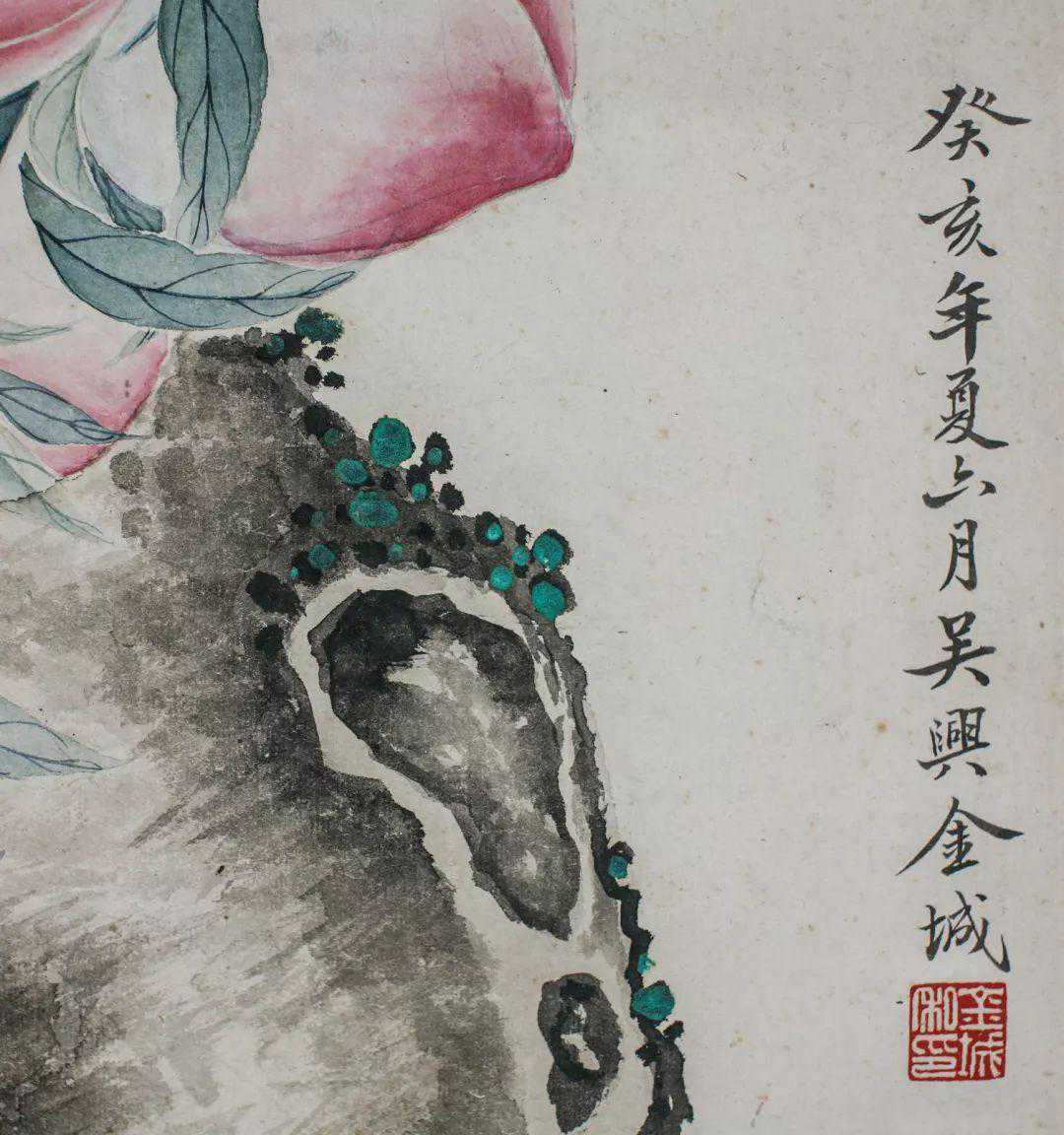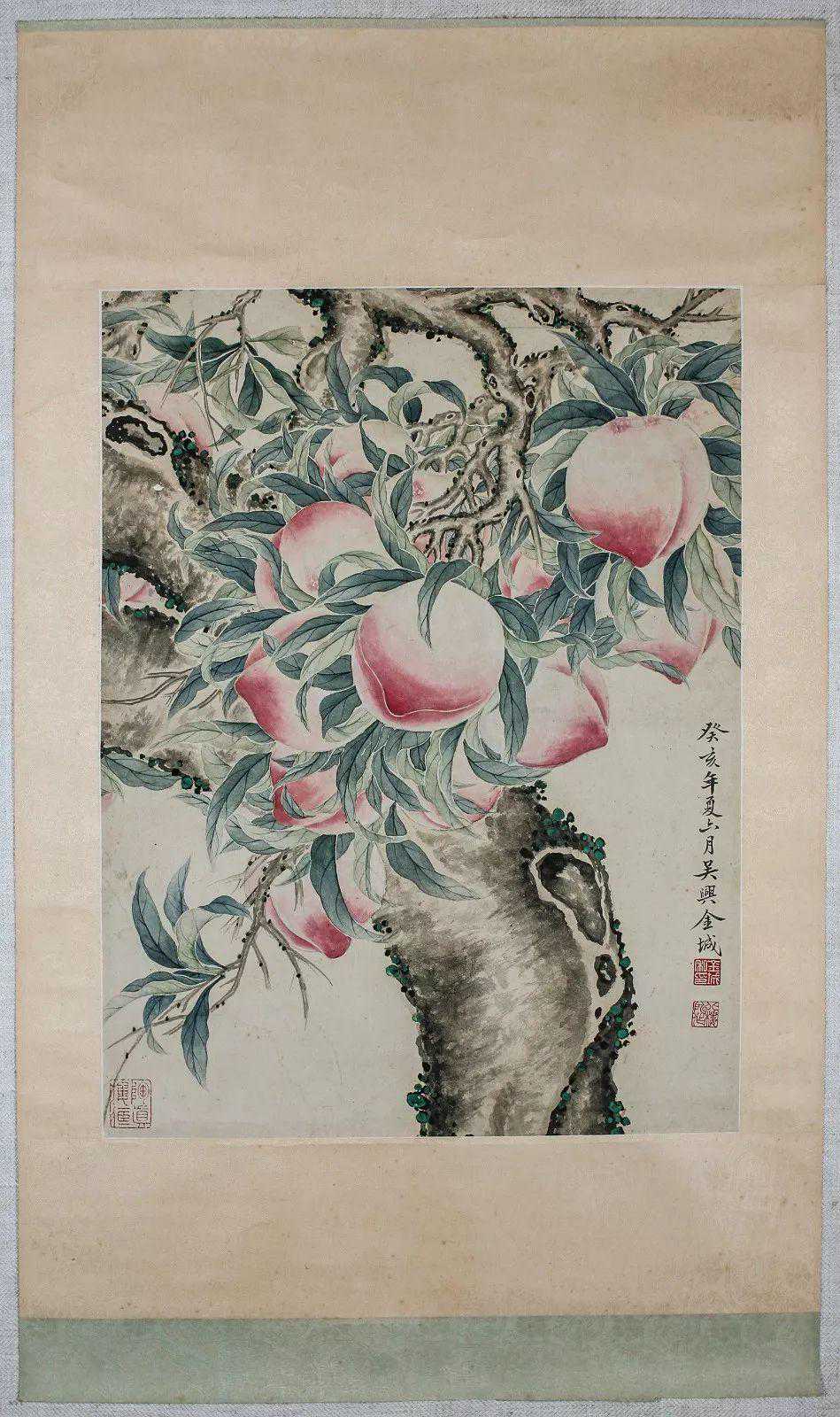 所以,湖社是非常重要的,这次给大家带来两件金城,一件绢本水墨《九如图》,实物真的好,但是拍不出来,哭;另一件寿桃,可以说是相当讨喜。