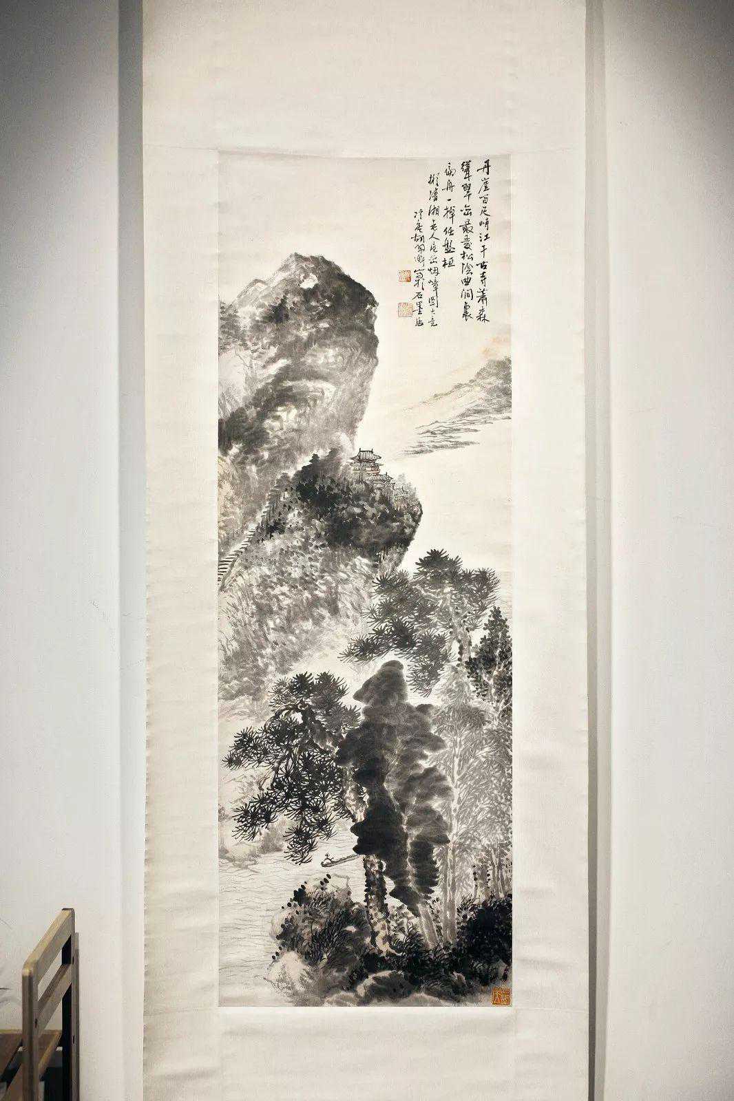 款识:丹崖百尺峙江干,古寺萧森耸翠峦。最爱松阴曲涧里,扁舟一棹任盘桓。拟清湘老人层峦烟嶂图大意。冷庵胡佩衡写于石墨居。