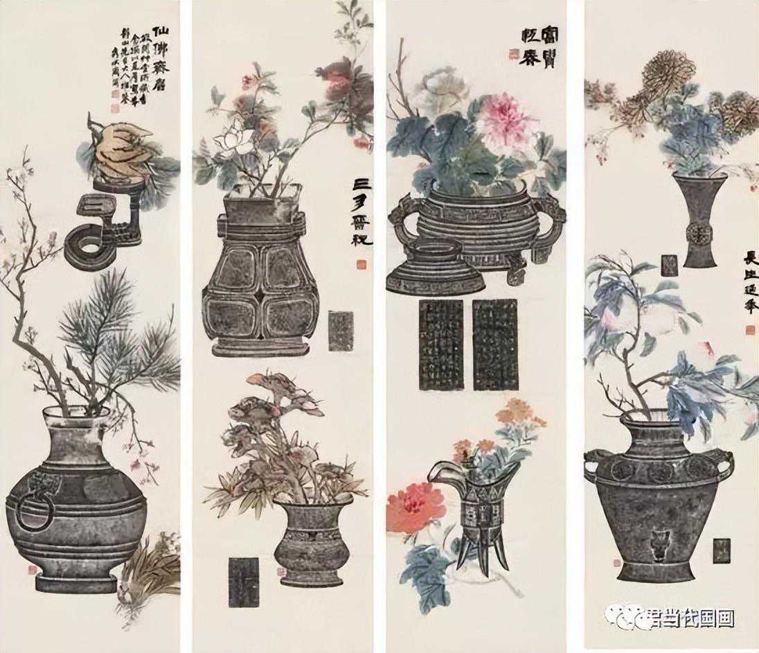 博古花卉四屏设色纸本