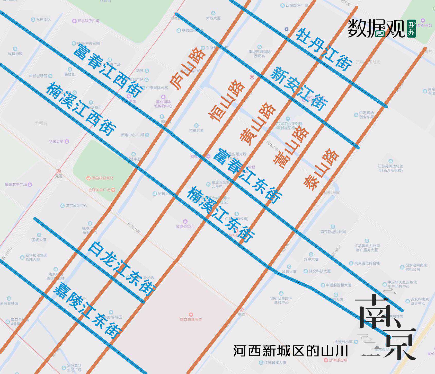 在南京的河西新城,山与河的交融在道路命名上达到了极致:横向道路以江河命名,纵向道路以山岳命名。