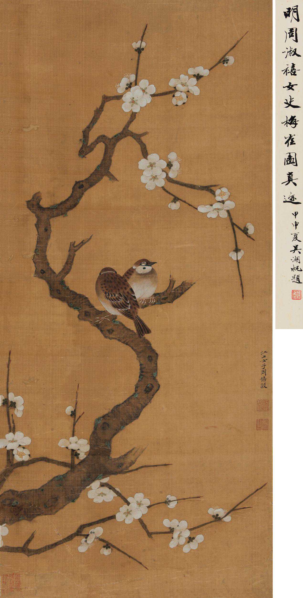 此件《梅雀图》在师法文俶的基础上,参以宋人笔墨,笔致细腻,工谨严整。《图绘宝鉴•续纂》记其:“家畜文禽,每作画时,辄取而对之。”正因其对事物有如此严谨的态度,才能创作出具“宋人格法”的作品。《国朝书画家笔录》言:“其画点染生动,神采焕发,翎毛更入微妙。年八十余犹不倦,人有其片幅者争宝之。”在当时人看来往往得其片纸便珍若拱璧,遑论今日周淑禧的作品存的已是鲁殿灵光,在各大博物馆有少量存世,民间所见者绝无仅有,又具梅景书屋主人吴湖帆题跋,为此作更增色不少。