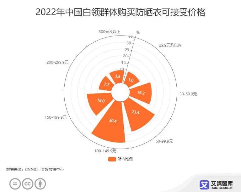 艾媒咨询数据显示,在2022年中国白领群体购买防晒衣可接受价格中,30.4%消费者会选择100-149.9元,占比最大,其次为60-99.9元和150-199.9元。