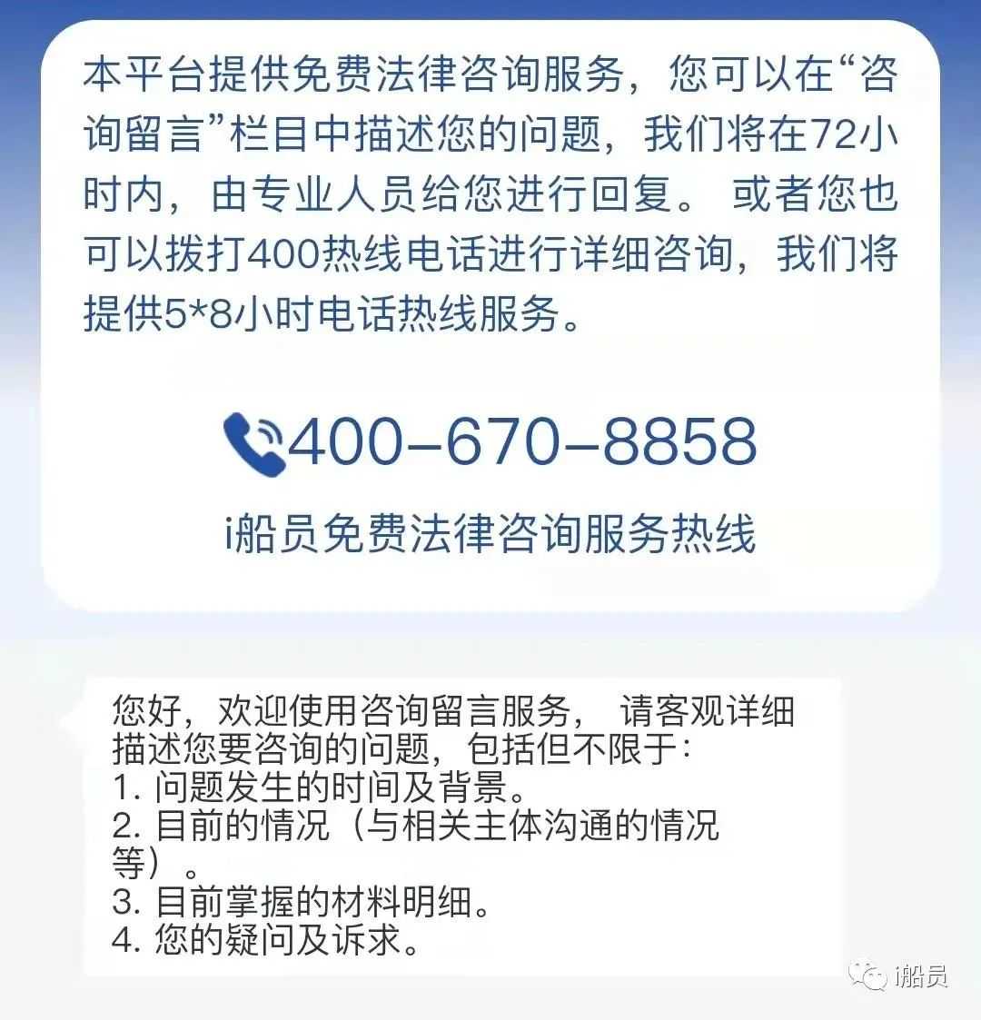 平台开通了全国船员公益法律咨询热线,,聘请19位专业律师,工作日工作时间接受电话咨询。也可登录“i船员”微信公众号在线咨询,平台承诺3个工作日内在线答复。