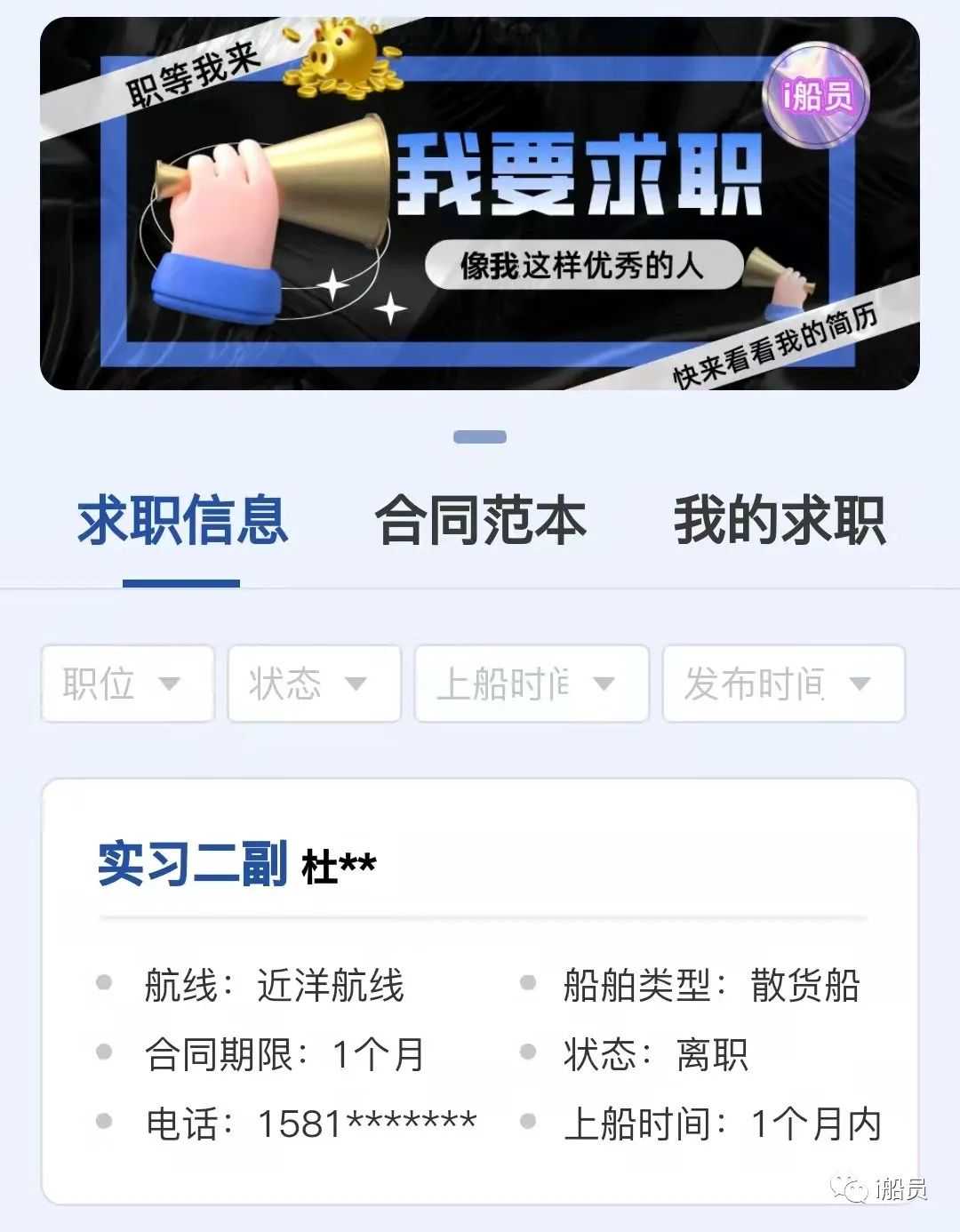船员在线填写求职意向,平台推动点对点衔接,减少中间环节,推荐合同范本。