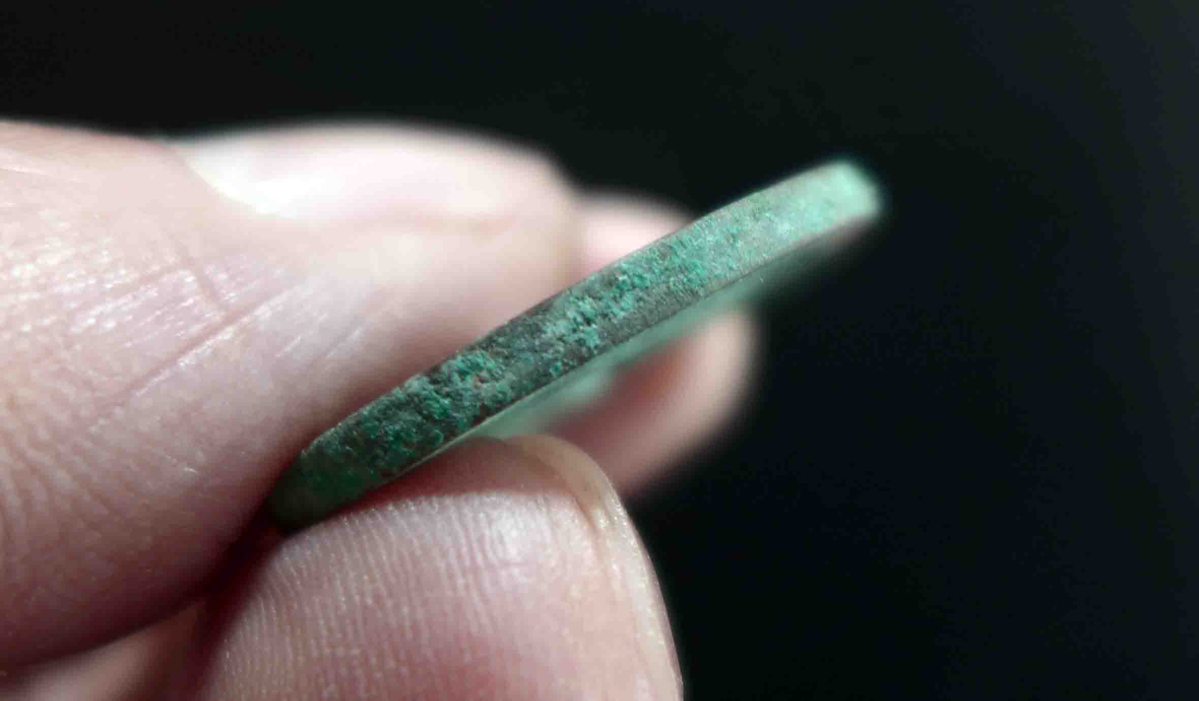 再察锈相。不难看出,本品锈色莽苍,鲜明而典型的北地窖藏生坑锈相。其盎然绿锈红斑,锈色纯真,裹缚钱体,深浅相间,色彩较为丰富,分布十分自然。测其锈痂皮壳,坚实而不糟。薄锈之处,可见包浆凝重,踏实不虚。续可识其乃青铜质地,铜色彰显老旧。显而易见,辩锈识浆,本品之锈相,耄耋真切,昭然一派自然天成之相,其门又开矣。