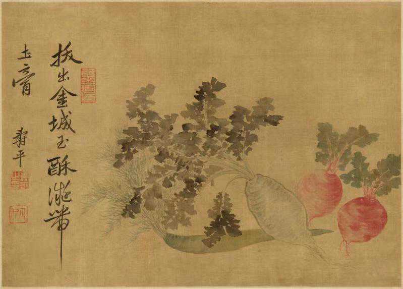 “岁朝清供图”可供选择的题材众多,后世选择景物多为含有吉祥寓意的花卉,配以各种雅器自由组合,以寄愿新年福寿康宁,又赋予新春吉祥寓意与文化内涵。古往今来,寓意着多福多寿的佛手,多子多孙的石榴,年年有余的鲤鱼、莲藕,喜上眉梢的梅花、喜鹊,平安如意的花瓶、如意等,都是画家笔下常见的吉物。汤禄名人物、仕女、花卉、禽鱼皆擅,尤以花果禽鱼最为人称道,秀润雅逸,格调颇高,是常州画派后期传人中成就较高的画家。