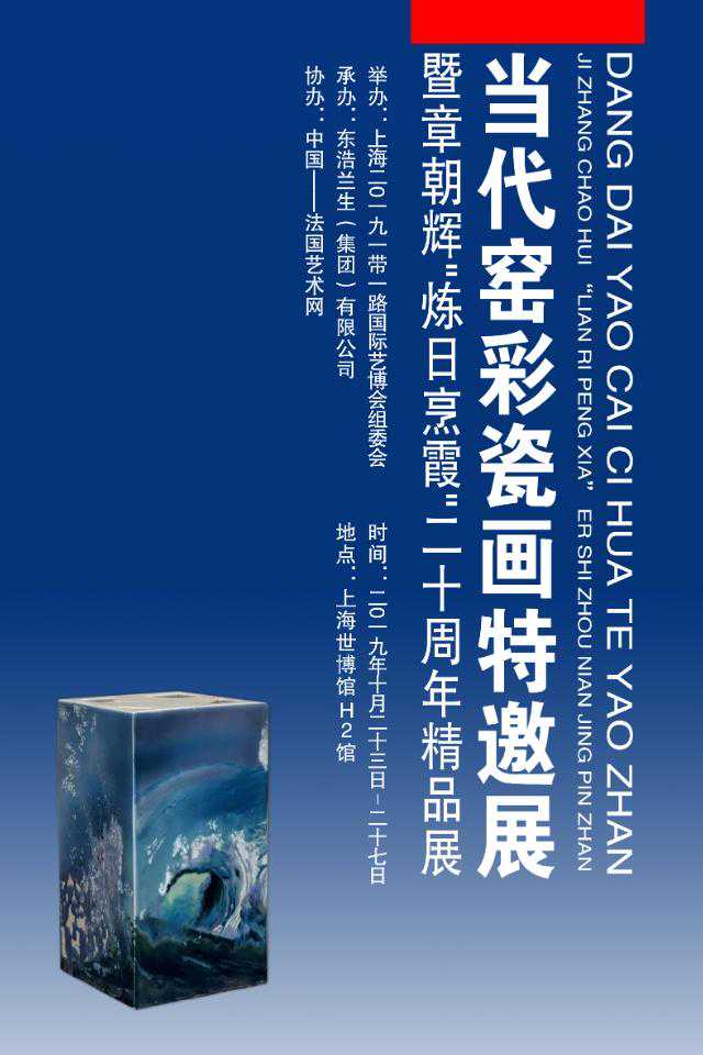 当代窑彩瓷画特邀展暨章朝辉“炼日烹霞”二十周年精品展由上海2019“一带一路”国际艺博会组委会举办的、中国——法国艺术网协办的、东浩兰生(集团)有限公司承办的“当代窑彩瓷画特邀展暨章朝辉‘炼日烹霞’二十周年精品展,将亮相2019”一带一路“艺术上海国际博览会,并将于10月23日至27日在上海世博馆H2馆隆重开展。