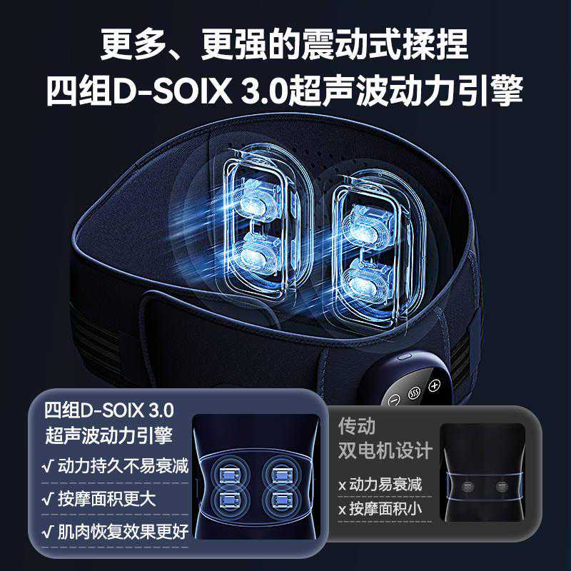 为了死磕发烧性能和不伤肌肉,未野自研35mm科学气囊顶腰设计、创新运动腹带设计、仿脊椎曲线的钢板支撑条设计等四重腰肌支撑,做到了对腰肌腰椎负担降低99.8%、腰肌支撑性提升130%!再加上独有的四组超声波动力引擎和双气囊理疗技术,不仅动力强悍且衰减度极低、震动稳定均匀,按摩面积和深度提升115%。