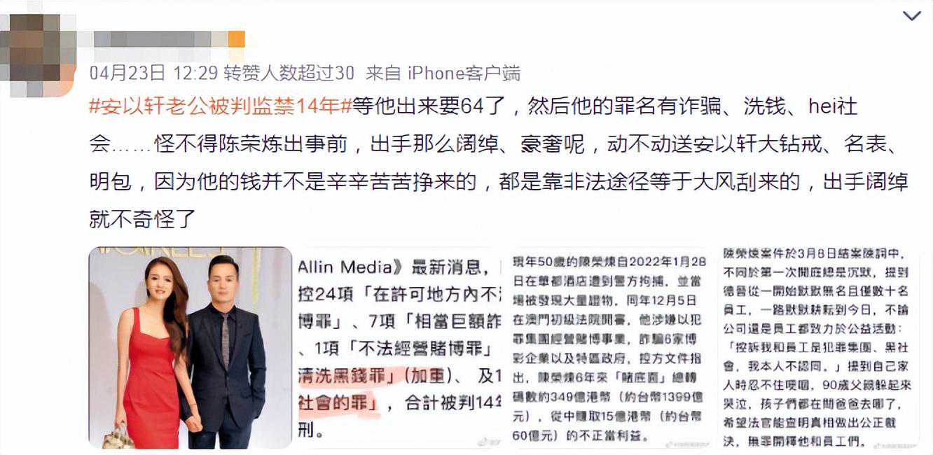 有掰扯他俩钱都去哪儿了的。有人觉得她赚翻了,因为陈荣炼赚了钱都打给她、有人说安以轩实惨,老公进去了她还得还债、还有八卦称陈荣炼被捕前有所察觉,把财产都转移到了前妻那边,不知道安以轩接下来打算怎么办……