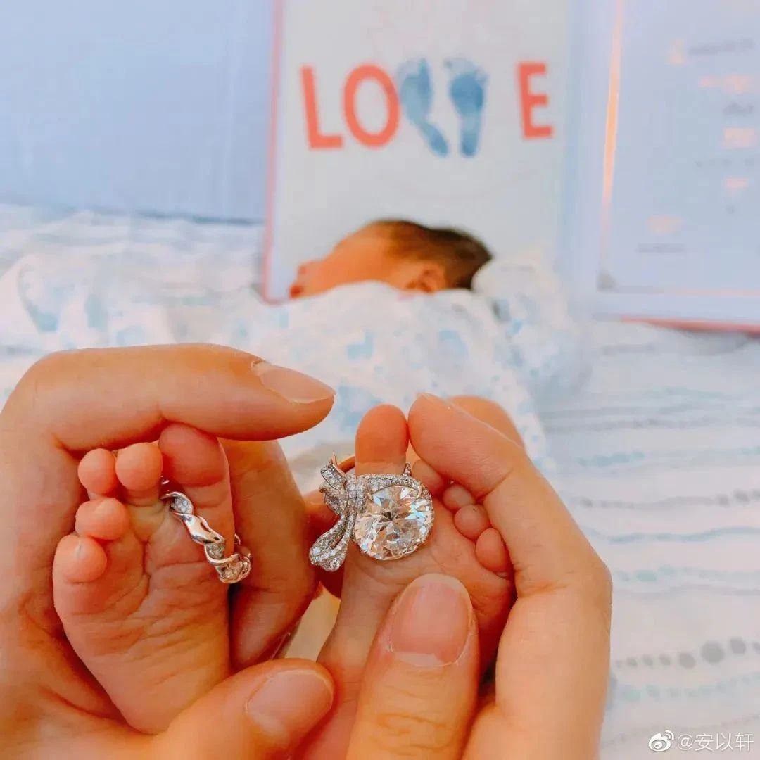 安以轩头胎生子后晒过孩子的小脚丫,上面挂着她结婚时戴的婚戒,那枚10.57克拉的钻石不仅创下了明星结婚的钻戒记录,更暗含陈荣炼对安以轩的告白,10.57=十全十美,我妻。