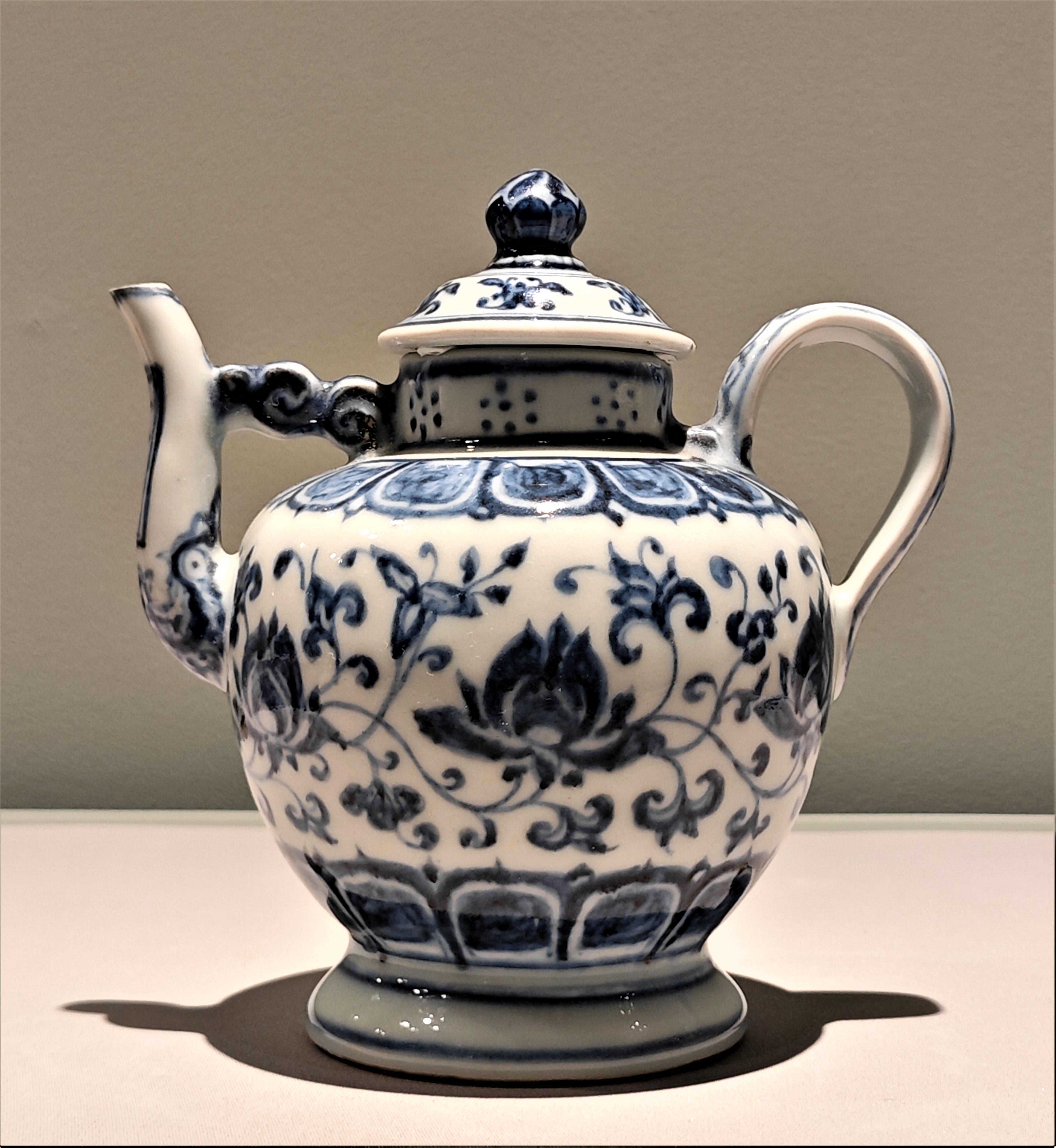 宜兴窑紫砂凸花纹诗文盖罐(左上)、银提梁方火壶(右上)、雍正款斗彩团菊纹盖罐(左下)、金爵(右下)
