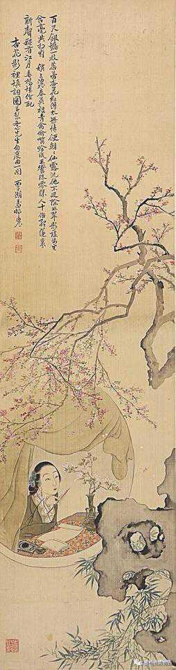 作品赏析:此图绘一窗前仕女,提笔凝思。几案上铺设纸砚水盂等文房,旁有玉兰在瓶,窗外杏花怒放,湖石丛竹,一片春闺文雅之趣。