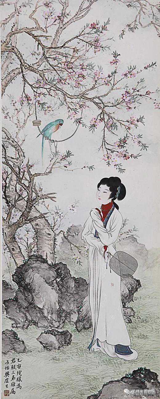 作品赏析:此作为仕女四条屏,写春夏秋冬之四景仕女,本幅写春日桃花初绽,绿草茵茵,春意蕴藉,执扇调鹦。