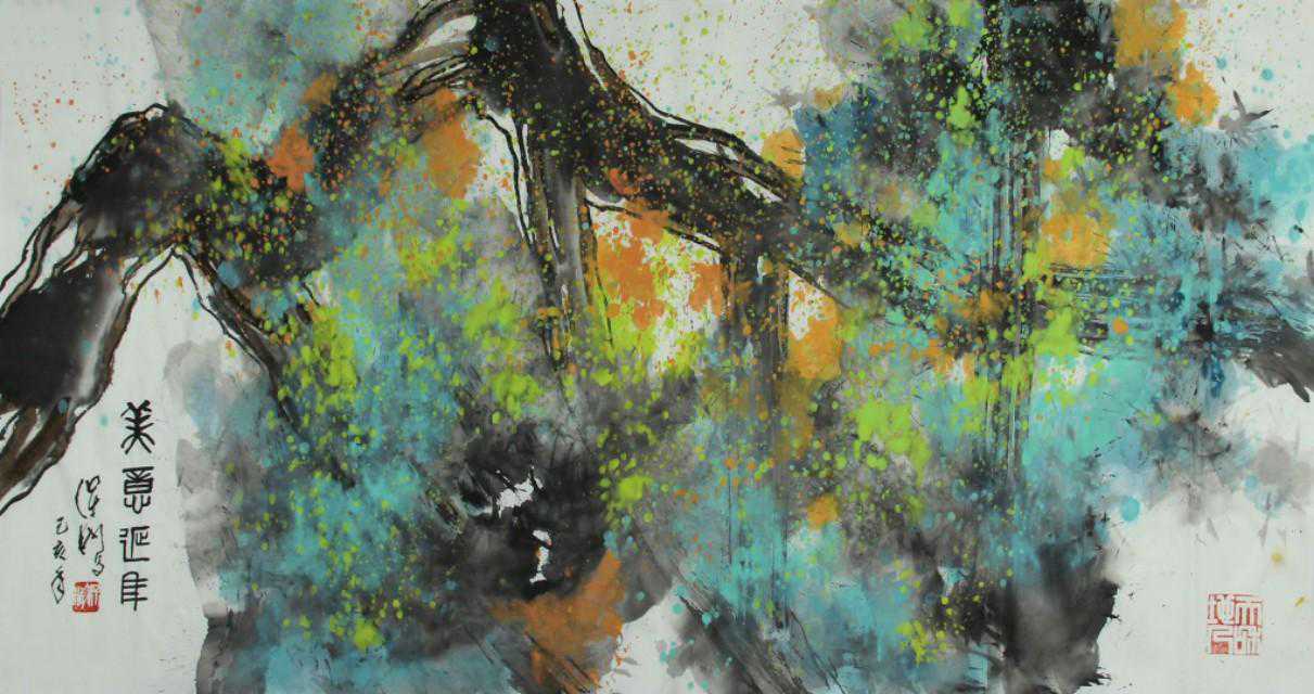 保彬的另一种风貌是融合西画和装饰画法,运用线条和墨彩的运动组合来表现某种即兴的精神感受。看似抽象,实为心象。这种写意不追求细节的具象完美,而凭借感觉和画兴,在画面的虚实节奏和韵律变化上经营位置、随类赋彩,抒发自由奔放的激情和悠思。他性格豪放,不拘成法,在整张或几张宣纸上即兴挥洒随意成象,由于有多年的功底和实践,他的即兴和随意,并非无源之水,无本之木,而是似与不似的树石草花之心象。他以心驭笔,混用刷、甩、泼洒、勾点等笔法在色调和韵律的变化中,营造斑斓中的统一和奇险下的丰富,有时在墨色中点染鲜亮色彩,突出生机的跳动。有时在华丽色调里,交错遒劲线条,平添思绪之曲折。这种心画合一的即兴写意,有别于赵无极西方式的“柔和流动”,也不同于刘国松注重技巧的“拼贴”和“水拓”,而是直接用笔墨表现感觉,用感觉重造画境。画家以心入画,自由写心,其笔下的感觉或明丽热烈、或雄放苍茫。蕴含生活思考和东方审美情趣,给人丰富的时空和生命联想,是兼有个人面目和中国特色的现代心象写意,这一融汇中西和装饰画风的艺术创新,尤适于在公共空间以多条屏形式连续展现,其天人合一的瑰丽画境与现代环境相映生辉,很受社会欢迎。和中国古典诗歌相似,这些写意大多乘兴而就,无标题任由读者自由畅想。其纵横挥洒的精神意兴,和出奇制胜的表现方法,生发出绚丽多姿、大象无形的审美效果。让人观之可游可思。其中,有表现对生命和谐的向往,也有赞美自然生机的顽强力量;有抒发不甘平庸、艰辛求索的创新豪气,还有对万千世相和情怀的艺术演绎。这些心象写意或以粗放水墨应物象形,奇而不怪。或用点、线、色、墨的迷离变化,表现造化奇妙及画家对自然和哲理的思考,有奇妙的东方哲学意境。真应了石涛所言“墨海中立定精神,笔锋下决出生活,混沌里放出光明。”