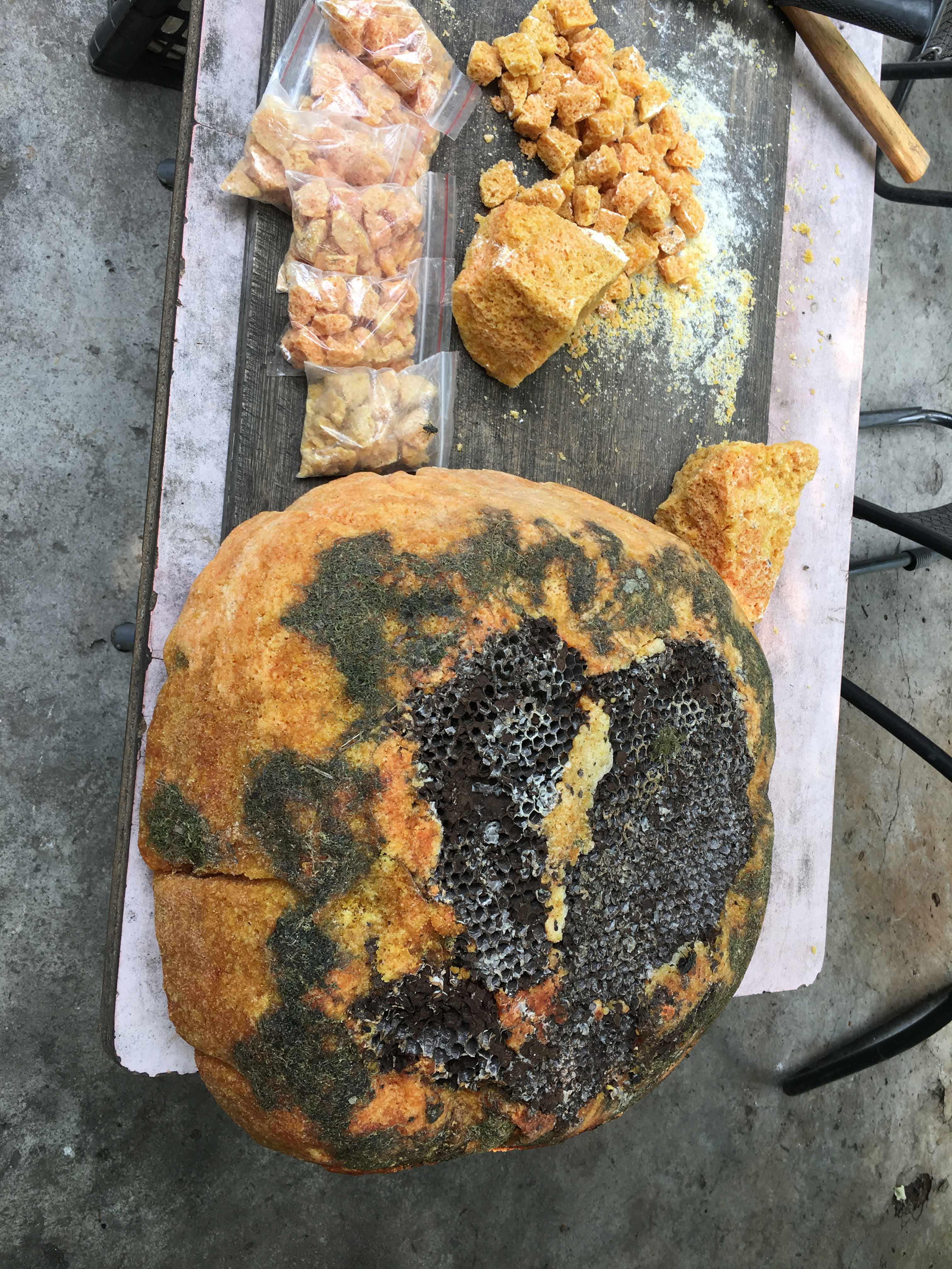这是卖石头和老蜂蜜块的,石头120元一个,也不知道贵还是便宜,蜂蜜没问,以前吃过,没吃出什么蜂蜜的味道,咬起来的感觉像白糖,泡水也感觉不干净,喝不太下去。也就没问价格。