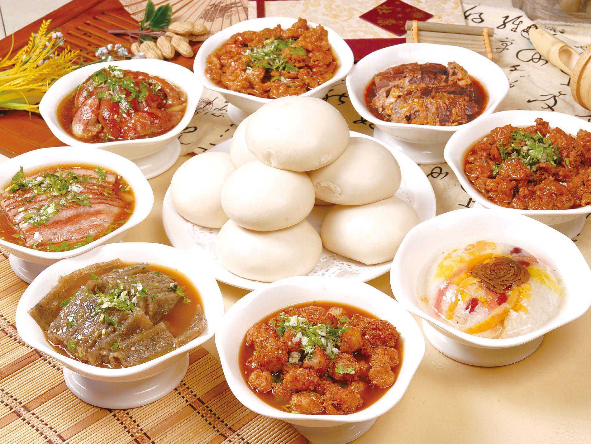 说说当时的席面,讲究“八大碗”,是啥呢?其实也就是用八寸青瓷笨盘盛着的,只不过肉都用碗子扣着馏的,像模子拓出来,都是倒扣的半圆形,这叫“服碗子”或“扣碗子”。