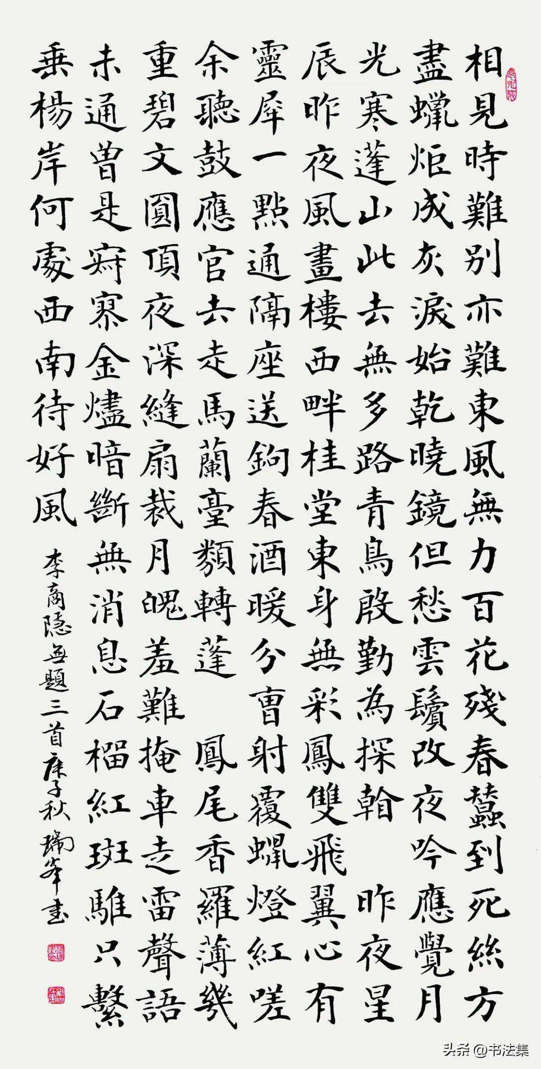 凤尾香罗薄几重,碧文圆顶夜深缝。扇裁月魄羞难掩,车走雷声语未通。曾是寂寥金烬暗,断无消息石榴红。斑骓只系垂杨岸,何处西南任好风。李商隐《无题》三首。庚子秋,瑞峰书。