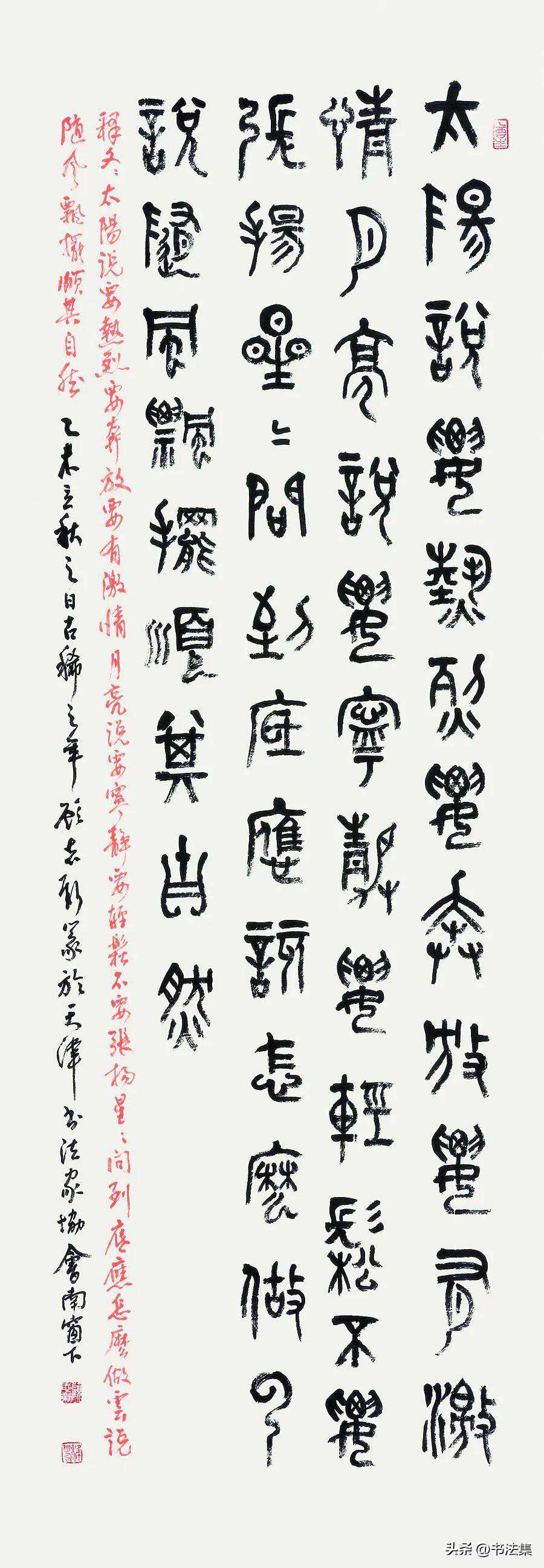 款识:太阳说,要热烈、要奔放、要有激情;月亮说,要宁静、要轻松,不要张扬;星星问,到底应该怎么做?云说,随风飘摆,顺其自然。乙未立秋之日,古稀之年顾志新篆于天津书法家协会南窗下。