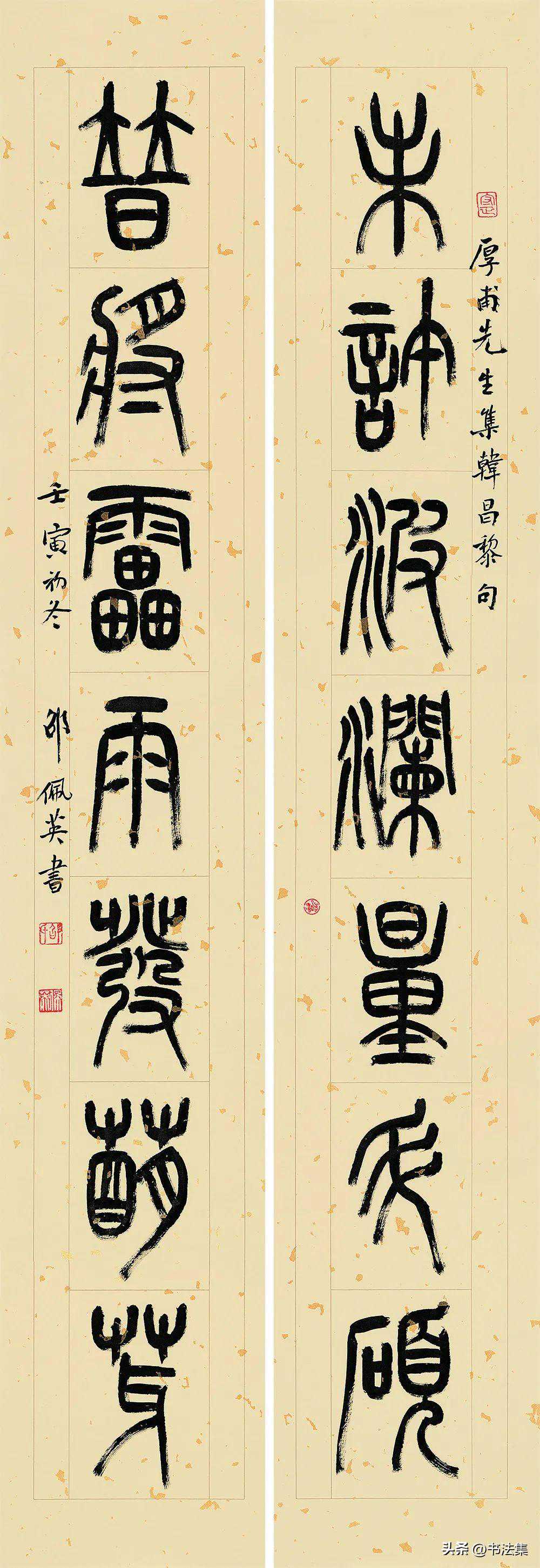 释文:未许波澜量斗硕;普将雷雨发萌芽。厚甫先生集韩昌黎句。壬寅初冬,邵佩英书。