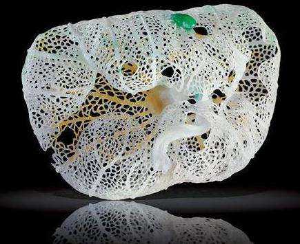 第四件“福从天降”高冰接近玻璃种的颤巍巍之工,利用这块料子的三种颜色和玉中的棉絮巧妙雕刻出花苞、叶脉、蝶翅纹等,这件捧到手里都怕化了拿着都不安全的作品,就是用简单的工具耗费数年制作而成。