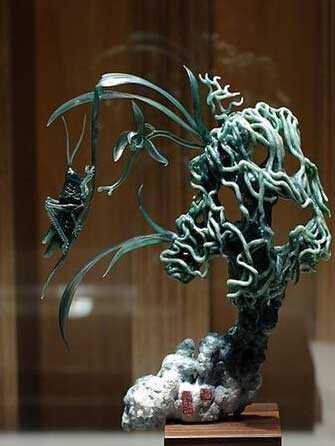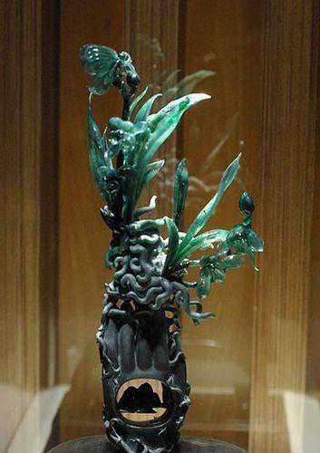第十三件“百年好合”,春带彩之色也是最受欢迎的翡翠料子,最香的花苞最美的蝴蝶就是最好的天作之合,而这样的生命是雕刻师给予的,再好的寓意却只能沦为一种谋生手段和升职之物是否可悲?