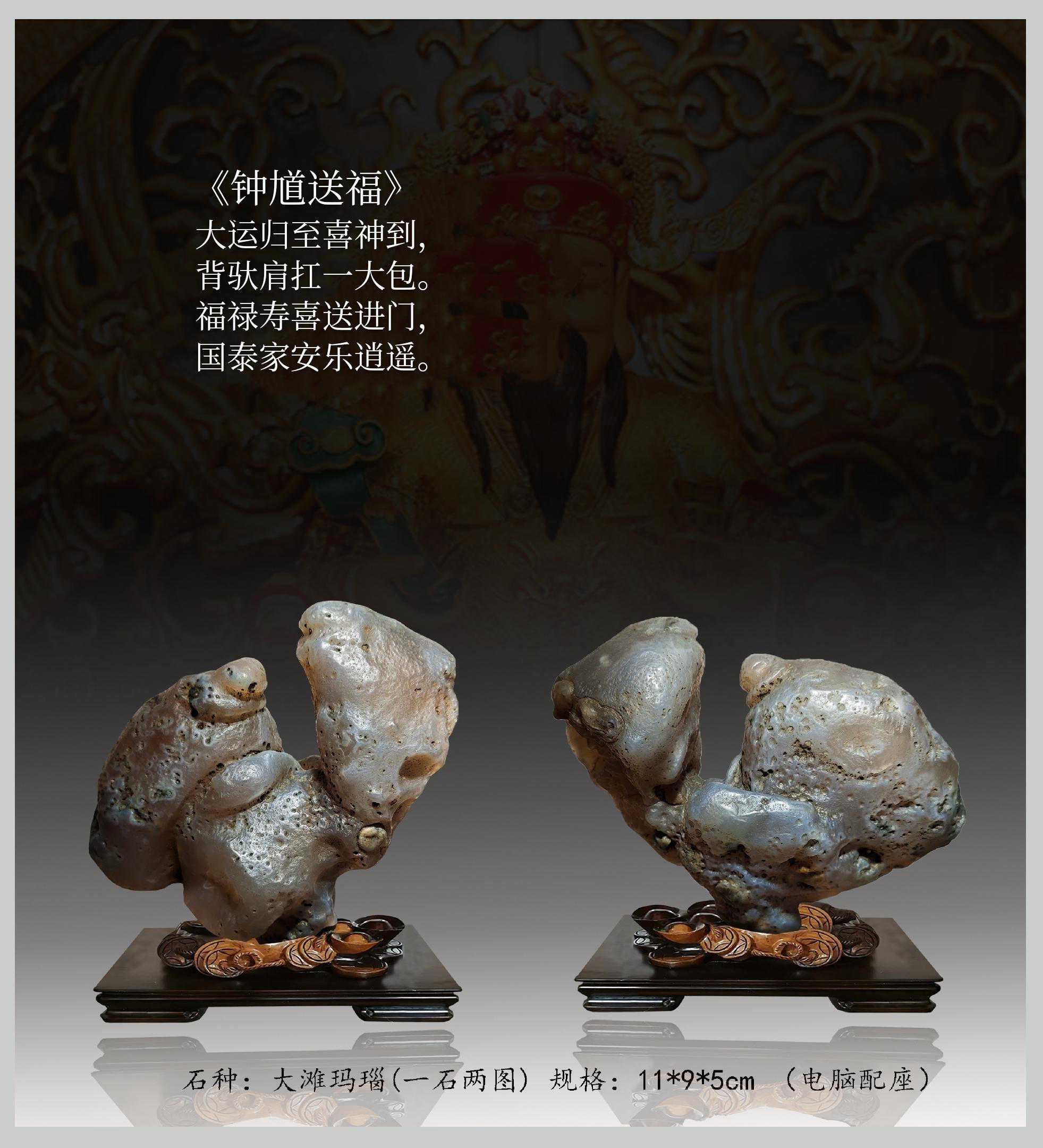 20年前,老刘又与奇石结缘,成为中石协创会时的初始会员,老刘收藏石头不计较石种,只要美,只要观赏主题自然天成、稀缺,形成难度大,能读出文化,品出故事,价高点也行,只要拿得动一定拿下,如果买不到手就会吃不香,睡不着。一次在洛阳石展上看到一方清江石,价高缺银子,就同卖方朋友协商,可否暂欠一部分,卖方欣然同意。石头拉回老家后,老刘立马带上早年收藏的纪念金币,急奔北京马甸市场转让还款。第二年还是在洛阳石展上,他又看上了一方大块清江画面石,后命名《群仙赴会》,因色彩、纹路都非常奇绝,寓意也好,可遇而不可求,但还是缺钱,没办法,老刘只好在石展上直接往美国打电话,让在美国斯坦福大学读研的儿子把他在学校贷的学费打10万过来,儿子说不买不行吗?老刘说全世界就此一方,我想买,错过了就再难遇上,钱以后可以再赚,同样的石头再找不来。儿子很孝顺立马给打了5万过来,老刘终于得偿所愿,满载而归。但后来老刘还是有点难受:为了自己的爱好不顾孩子的学习,我是不是有点太自私了。
