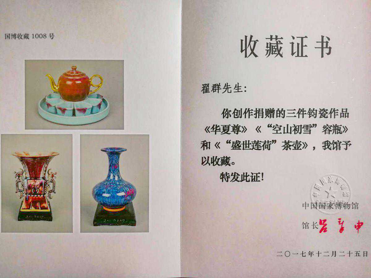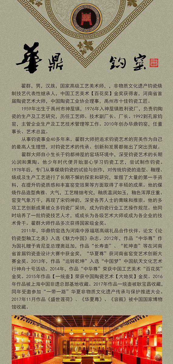了解翟群的人都知道,翟群在1976年进入神垕镇胜利瓷厂工作。在胜利瓷厂,翟群历任工艺师、技术副厂长、厂长等职,对传统钧瓷的造型、釉理、烧成及生产工艺进行了长期的探索和研究。其后,翟群被河南省陶玻协会授予“河南省陶瓷艺术大师”称号,其也是该称号的首批获得者。1992年,翟群开始在孔家钧窑从事生产及工艺技术管理工作。2010年,翟群创建华鼎钧窑。