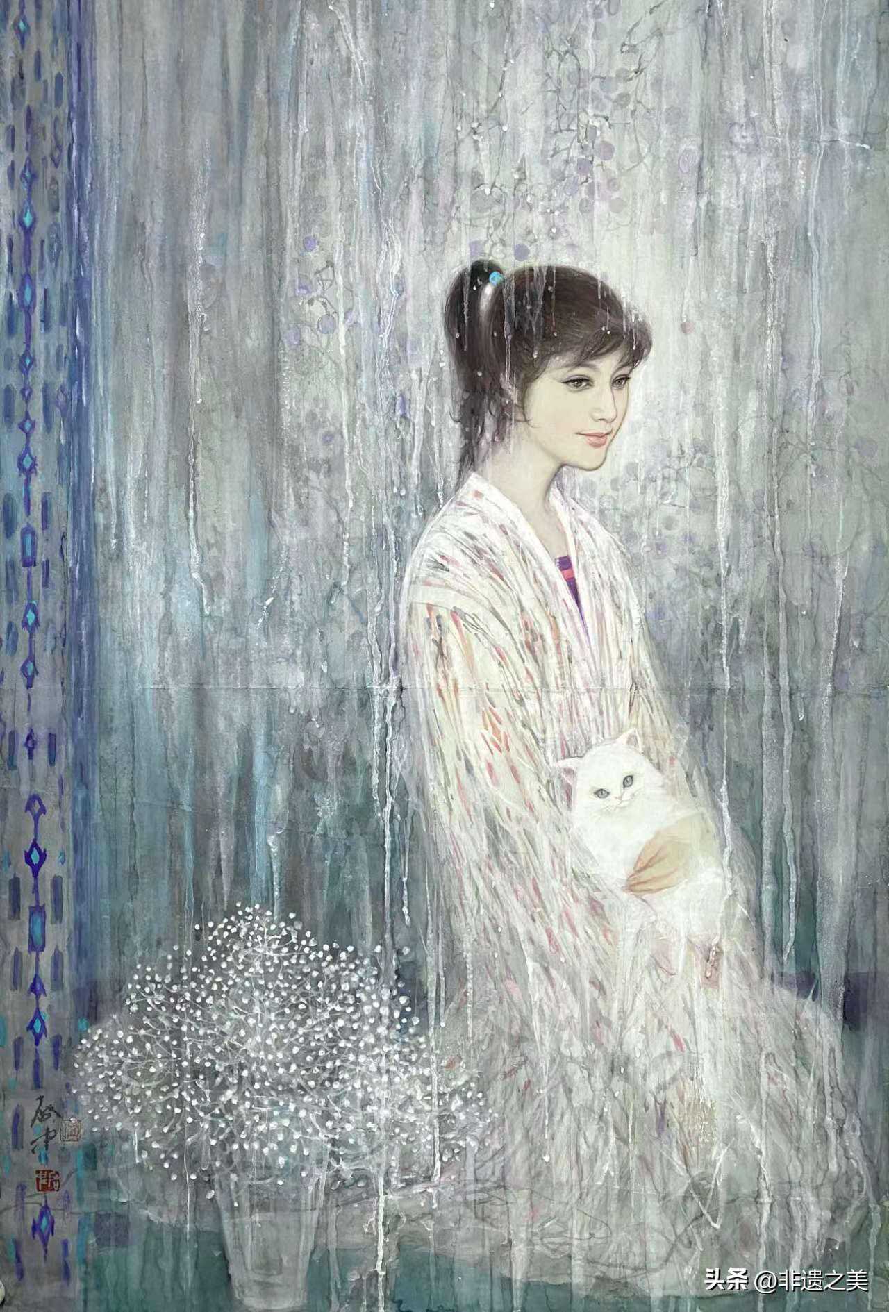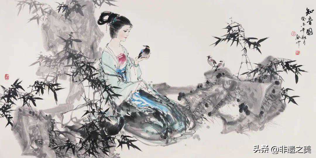 “综合”的面貌基对于多种绘画因素的同时性调动与运用,这只有拥有较强整体意识的画家那里才能实现。在伍启中的画中,造型是第一位,他深受学院派的熏陶,造型能力严谨地刻画形象的具体面貌,用精微的高古线条塑造人物和景致,线条成为物象生成的基础,也构成作品结构的骨架。与此同时,他注重发挥工笔敷色的效果,同样精细地用色彩塑造物象的体感和质地,使工细的语言成为画面确立的主导语言。这个基础上,他把水墨渲染作为营造画面空间的手段,用大片的水墨或以色代墨,形成画面松动、丰富的氛境和流畅的气韵。