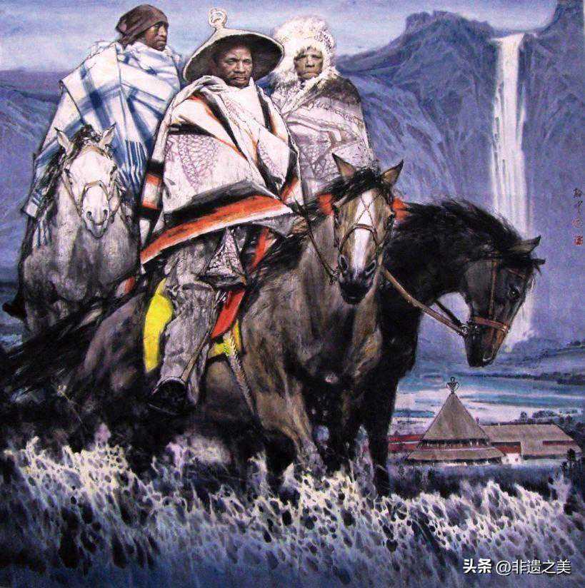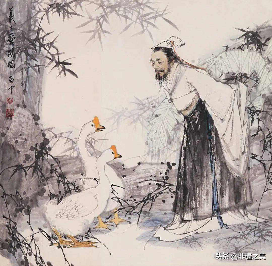 试看《王右军爱鹅图》中表现王羲之和鹅、背景用的稚拙刚劲的线;《印度舞蹈》中刻画印度姑娘用的圆润柔和的线;《春晖》写美女用的行云流水的线;《风雨青纱帐》中的人物表现三位军人的无拘无束用的线断意不断的线,还有貌似不经意的线、简之又简的线,繁而又繁的线,以及线与色交融或与墨穿插等多种手法,随机应变,不同的线意对画面旋律和结构产生了不同的作用,伍启中理解和掌握了“中国画就是一个线的艺术天地”的形式规律,因此将线演绎到出神入化、不期而然的境界。在线意丰富变化的基础上,他落墨中肯大气、笔法灵动洒脱、少许点缀颜色、强调黑白效果,暗合了中国传统绘画倡导的“五色缤纷不易古雅”的审美之道,符合中国人几千年来形成的审美习惯。