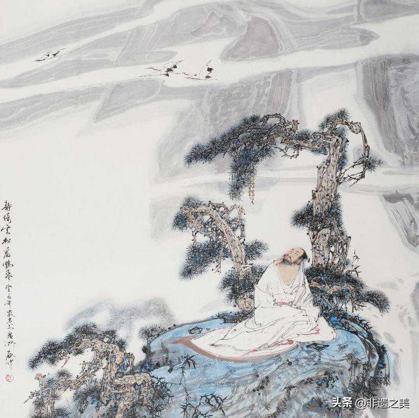 中国画笔墨言语除线之外,形与构成是另外两大要素,谈到形,一些专家学者认为伍启中的人物在写实的基础上适度夸张变形,我想这大概是相对上世纪五十年代以来学院派画风而言,几十年来学院派倡导的造型准确结构严谨地绘画原理,成了学校正规的教学经验,在社会上被视为正统的审美原则,新时期以来解放思想更新观念,中国画固有的审美理念得到了肯定,写实画风受到挑战,“新文人画”等画派应运而在,有些人受外来绘画思潮影响走的更远,伍启中则守成中庸,他对学院派的画风既不完全排斥,也不全部延用,有追求客体、“形”和“影”的准确,而转变为注重主体“心”和“性”的抒发,他的这一审美理念完全体现在了他创作和各类艺术形象中,不必反复用他的一些代表作做说明,只要看一眼他借助古风古境,反映现代人生感悟的古人形象,到了阿睹传神的境界,我们就不得不佩服他刻画形神的高超。