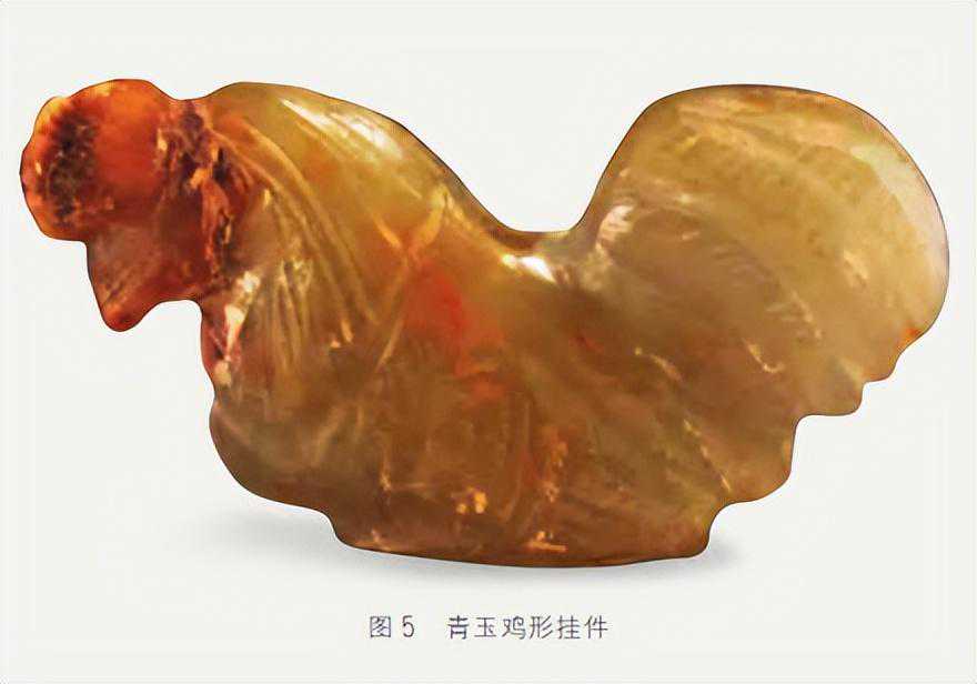 青玉鸡形挂件(图5),杭州外东山弄宋墓出土,收藏于杭州博物院。青玉镶有黄色斑点的圆形雕刻。