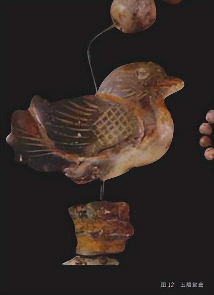 黄玉鸭(图6)高4.5、纵长8.5、宽2.8厘米,收藏于台北故宫博物馆。这是一种黄色的玉石,是新疆产的和田玉,色泽光滑,极似鸡油黄;