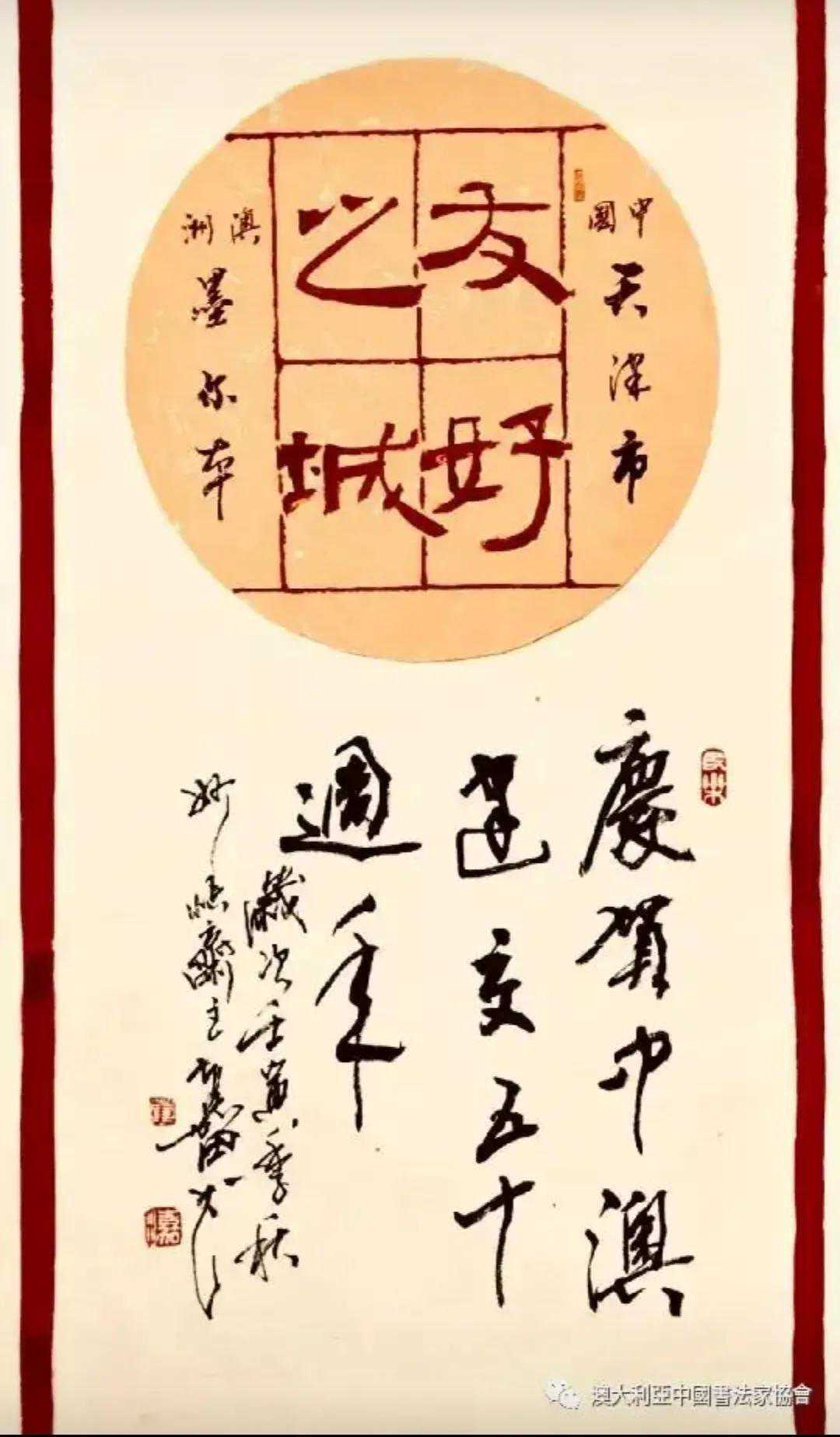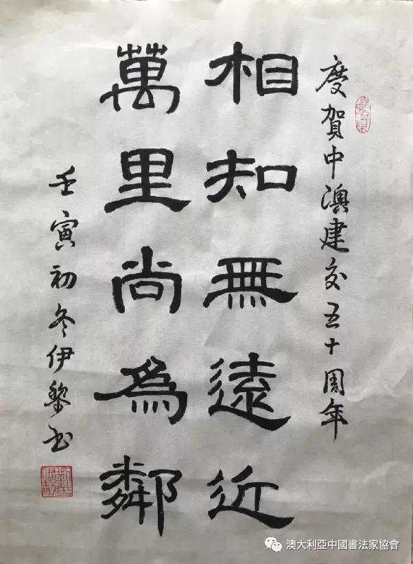 ,我谨代表中华人民共和国驻墨尔本总领事馆,祝贺澳大利亚中国书法家协会为庆祝中国和澳大利亚建交50周年举办书法云展。