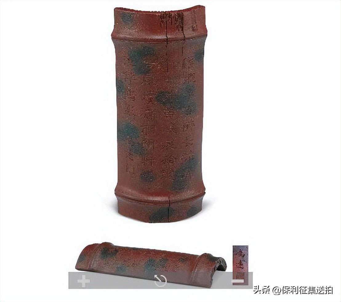 说明:臂搁系文玩用具,是陈鸣远作品中最具艺术性的作品之一。臂搁仿湘妃竹形,紫泥制成,仿若竹子经长期使用抚摸而形成了深厚的包浆。陈鸣远善师法自然,臂搁之上以深色泥绘出湘妃竹特有的泪斑,极其形似,而所仿竹节,连竹子特有的斑节以及竹子年久开裂而形成的裂痕,都惟妙惟肖加以模仿,宛若天成。臂搁上刻以隶书铭文:"陶家千秋师天工,潇湘遗风化苍节,红楼一曲歌长恨,今古奇缘诉道然。""陶家千秋师天工"诗句则是陈鸣远自己艺术创作的最好写照,师法自然,而不拘泥,具有自然天成而不矫揉造作的艺术效果。