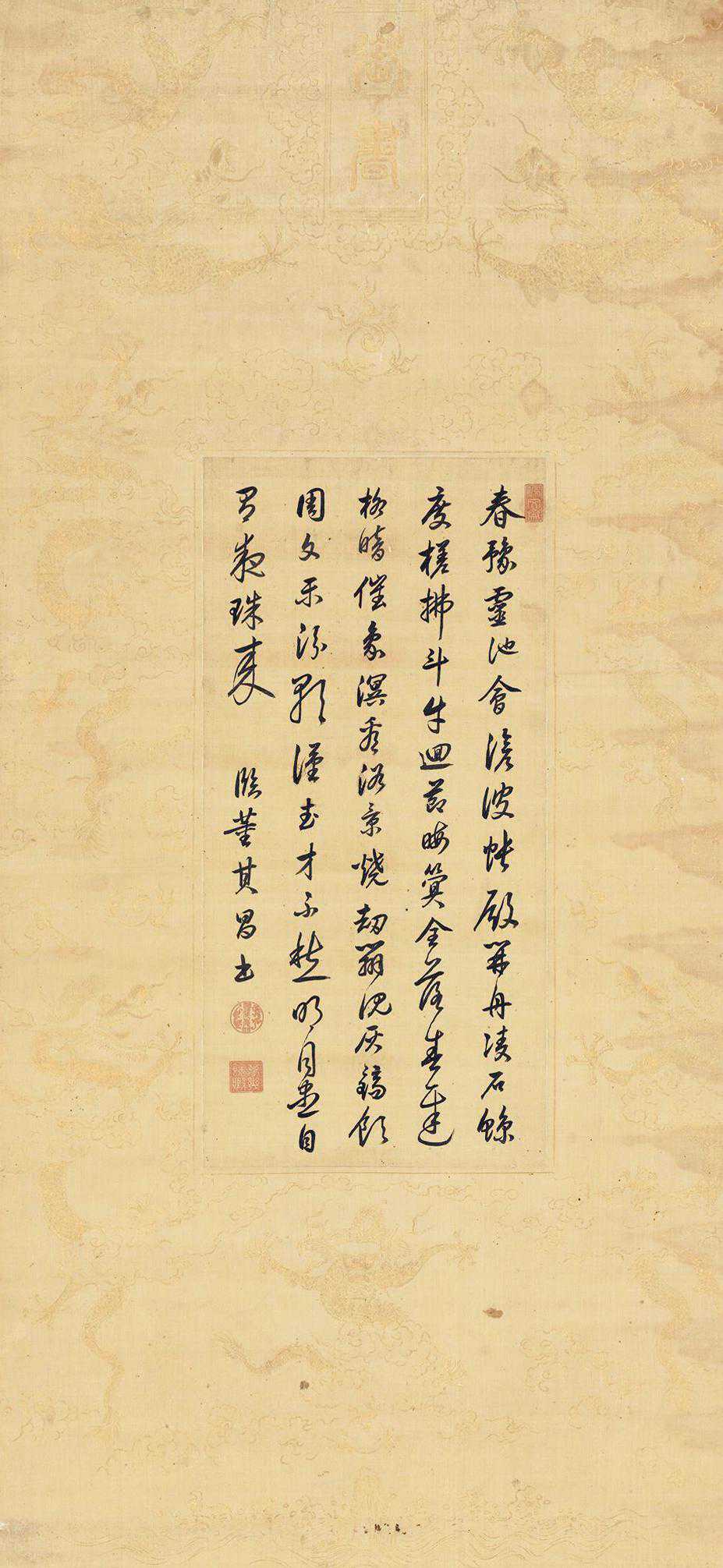 2014年北京秋季拍卖季上,北京翰海推出康熙帝行书立轴《朱子诗》,吸引了众多买家的眼球。该拍品为原装初裱,黄绫天地头、素绢手绘云龙隔水、象牙轴头、花梨木盒外带浮雕海天云龙、内嵌描金龙纹宫纸,精工细作,是一件极为少见的宫装宫裱艺术珍品。