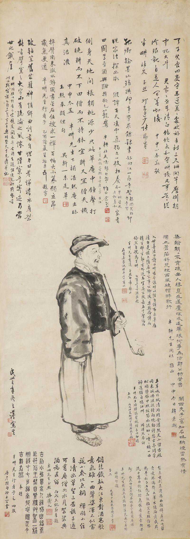 既是“赁庑”,当是有偿,韩凤九问道“可有僧庵如水月,袈裟典酒为君留”的情况大概没有发生。此之后朋酒之会颇多,所见作品也大多作于这一时期。在入寺不久,半耕便请张镛为其画《行乐图》,(图12)画面中半耕毡笠芒鞋,手持烟杆侧身而立,脸庞较旧时更为瘦削,多了一缕山羊胡。此时距《别号图》又有近十年,促膝雅侣间,又有十余处题跋。