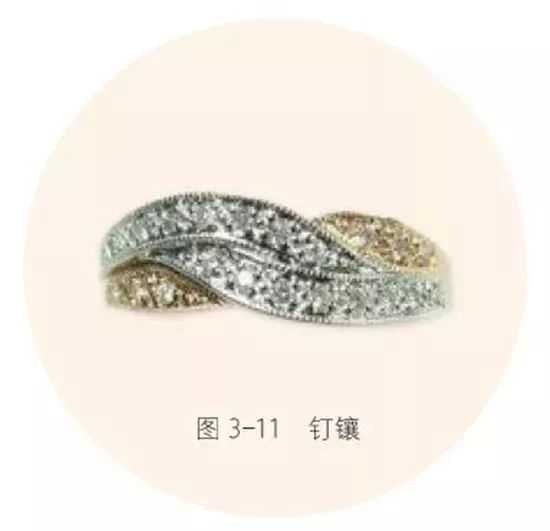 钉镶(或铲钉镶)的几个小钉,其支撑力不大。这种镶嵌工艺不适合于大颗粒宝石,通常用于群镶小粒宝石。