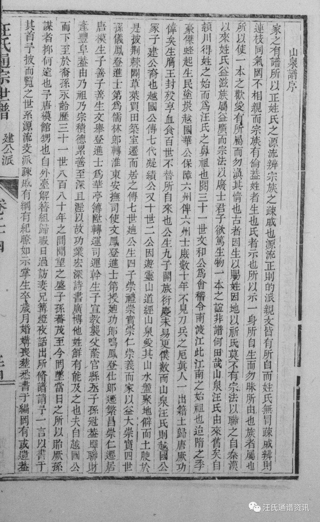 山泉汪氏,由來舊矣。自潁川得姓之始,而為汪氏之鼻祖也。閱三十一世,文和公為會稽令,南渡江,此江南之始祖也。迨隋之季,豪傑蜂起,生民塗炭,越國華公保障六州,俾六州士庶數十年不見刀兵之厄。真人一出,籍土歸唐,厥功偉矣!生膺王封,歿享血食,百世不替,所自來也。公生九子,開族衍慶,未易更僕数。而山泉汪氏,則越國公冢子建公裔也。越國公傳七代凝績公,又十世二公,因遊靈山,道經山泉,愛其山水盤聚,地僻而土腴,於是披荆棘,闢草莱,買田築室,遷而居之。傳七世廸公,生四子崇禮、崇實、崇仁、崇義,而家以益大。崇實四世孫儀鳳,登進士第,為儒林郎,轉淮東安撫司使;文鳳,登進士第,授迪功郎;鳴鳳,登仕郎,遷繁昌。崇仁遷居唐模,生子善。子善生文舉,登進士,為華亭簿,陞轉運司運幹。生子宣教,襲父蔭,官縣丞。子孫冠蓋蟬聯,財產豐阜,蓋由乃祖乃宗積德累善至深且渥,以故功業宏深,詩書廣博,他姓鮮有能及之也。夫自越國公而下,至於裔孫永齡,歷三十一世,八百八十年之間,聞望之盛,子孫蕃茂,至今罔墜。當日之所以貽厥孫謀者,抑何遠也!