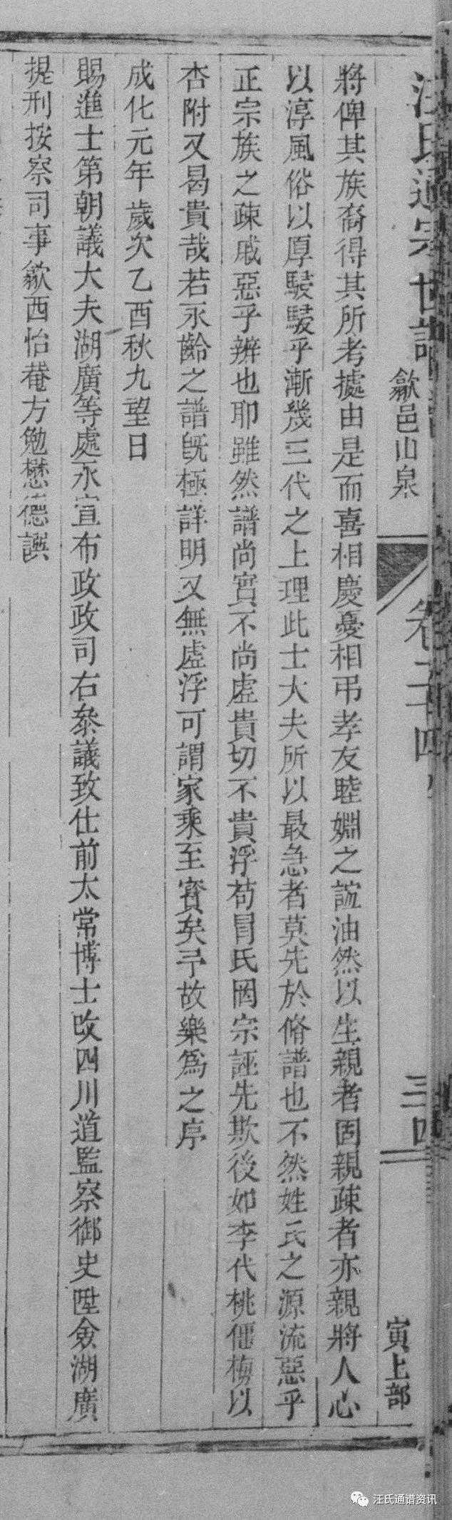 予唐模館甥也,自外臺解簪組歸,暇日過訪妻兄,篝燈夜話,出所修譜,請予一言以書于其首。予披而覽之,世系源流、支派疎戚,有綱有紀,瞭如示掌;生卒歲月、婚媾喪葬,悉書于編,罔有或遺。蓋將俾其族裔得其所考据,由是而喜相慶,憂相吊,孝友睦婣之誼,油然以生;親者固親,疏者亦親,將人心以淳,風俗以厚,駸駸乎漸幾三代之上理。此士大夫所以最急者,莫先於脩譜也。不然,姓氏之源流惡乎正,宗族之疏戚惡乎辨也耶?雖然,譜尚實不尚虚,貴切不貴浮,苟冒氏罔宗,誣先欺後,如李代桃僵,梅以杏附,又曷貴哉?若永齡之譜,既極詳明,又無虛浮,可謂家乘至宝矣。予故樂為之序。